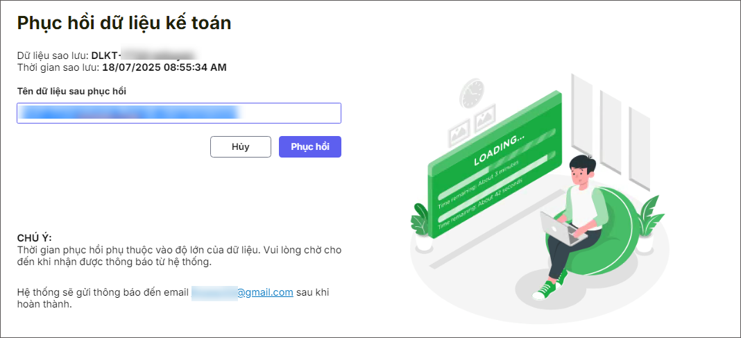 Bước 5: Sau khi phục hồi dữ liệu thành công, hệ thống sẽ thông báo cho anh/chị biết.
