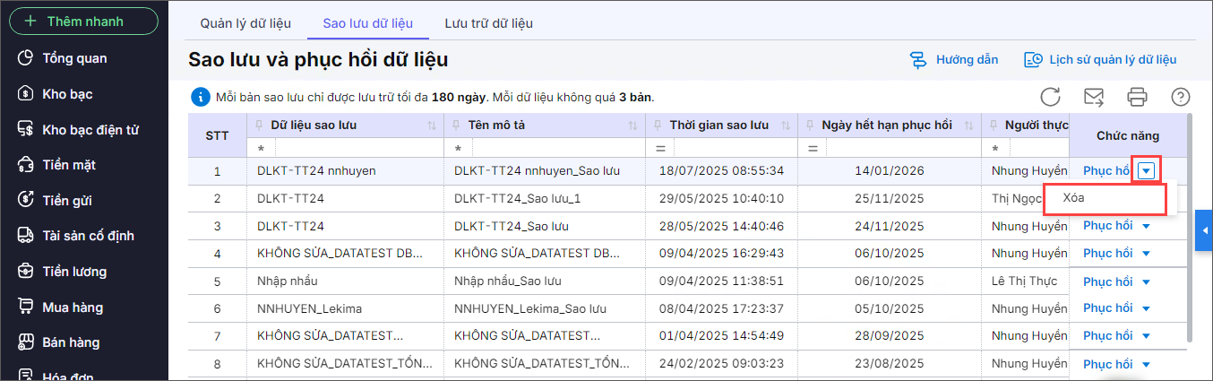 Nếu muốn xóa dữ liệu sao lưu nào thì anh/chị nhấn vào dấu mũi tên cạnh chức năng Phục hồi, chọn Xóa.