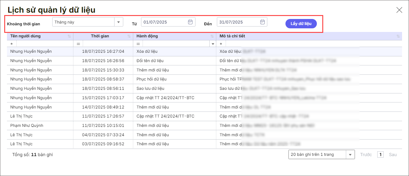 • Nhấn Lấy dữ liệu. Hệ thống sẽ lấy lên lịch sử các hành động liên quan đến dữ liệu của đơn vị gồm: