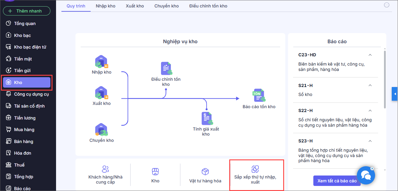 Bước 1: Tại phân hệ Kho, nhấn Sắp xếp thứ tự nhập, xuất.