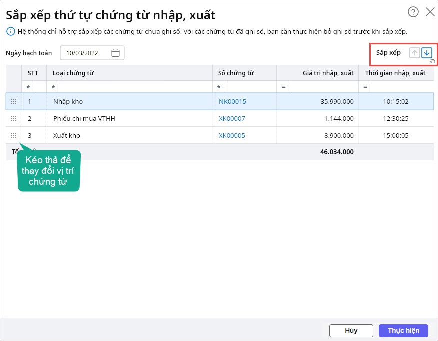 *Lưu ý: Hệ thống chỉ hỗ trợ sắp xếp các chứng từ chưa ghi sổ. Với các chứng từ đã ghi sổ thì cần thực hiện bỏ ghi trước khi sắp xếp.