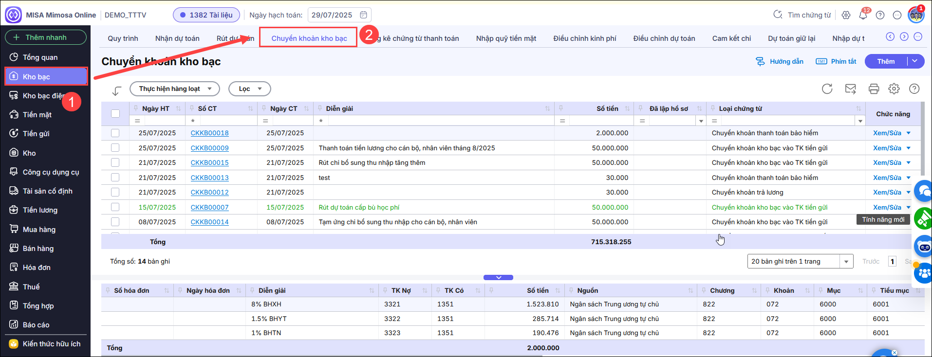 2.2. Giải phápBỏ ghi và xóa chứng từ chuyển khoản kho bạc mua TSCĐ Bước 1: Vào phân hệ Kho bạc\Chuyển khoản kho bạc\Danh sách chuyển khoản kho bạc.