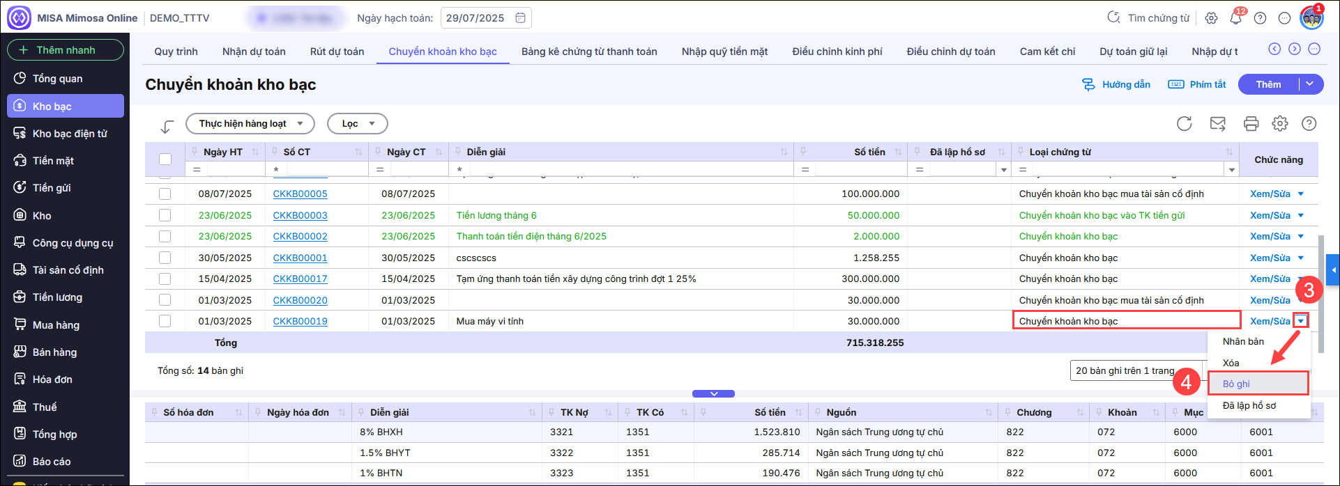 Bước 2: Trên danh sách Chuyển khoản kho bạc, tìm đến chứng từ mua tài sản cố định, cột Loại chứng từ là Chuyển khoản kho bạc và tích vào hình tam giác chọn Bỏ ghi.