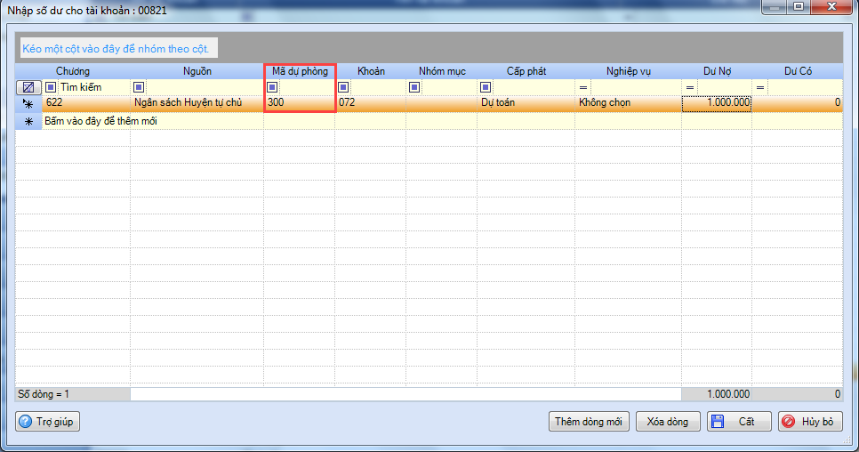 2. Tại Nhập số dư ban đầu chọn mã dự phòng có liên quan, sau đó nhập số dư tương ứng