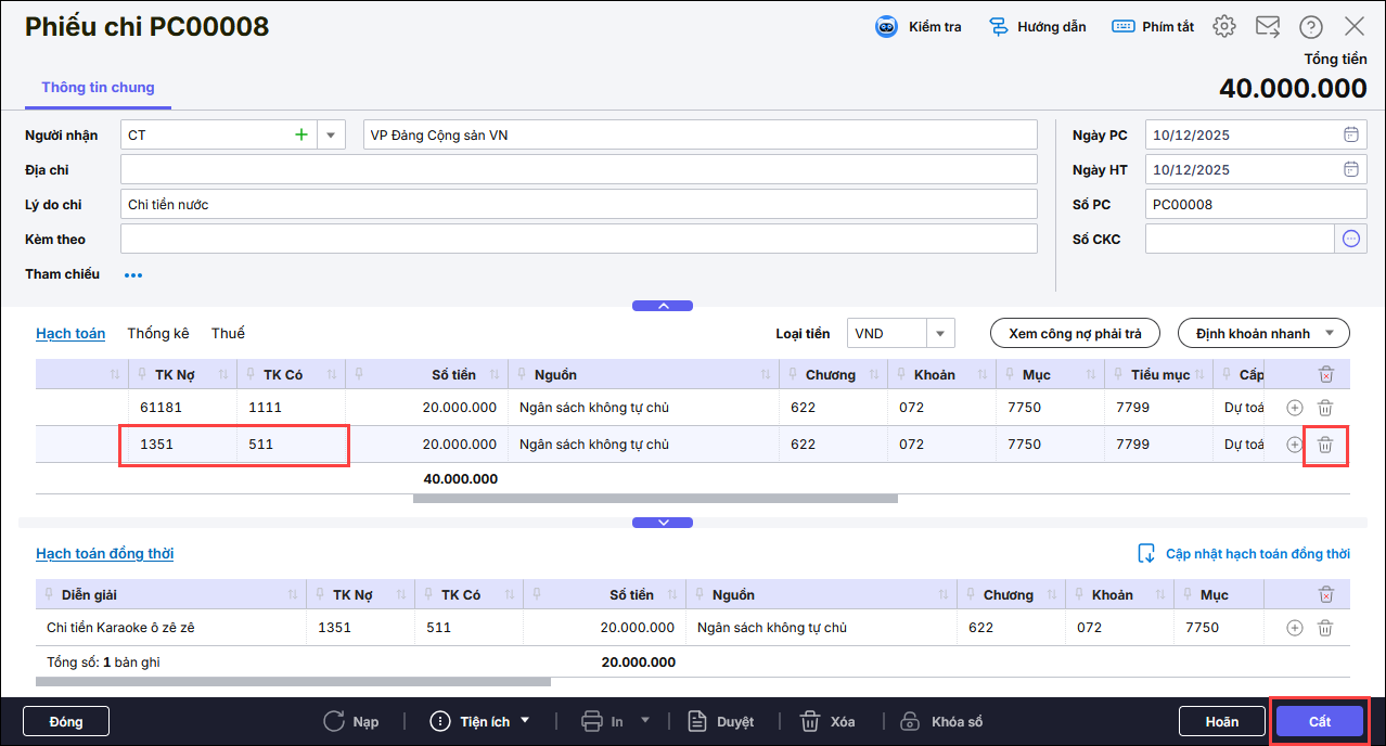Mở các chứng từ chi tạm ứng đã làm, kiểm tra nếu có tự hạch toán thừa bút toán Nợ TK 1351/ Có TK 511 thì thực hiện Bỏ ghi, nhấn sửa, nhấn vào biểu tượng thùng rác (?️) ở cuối dòng để xóa dòng thừa đi -> Nhấn Cất