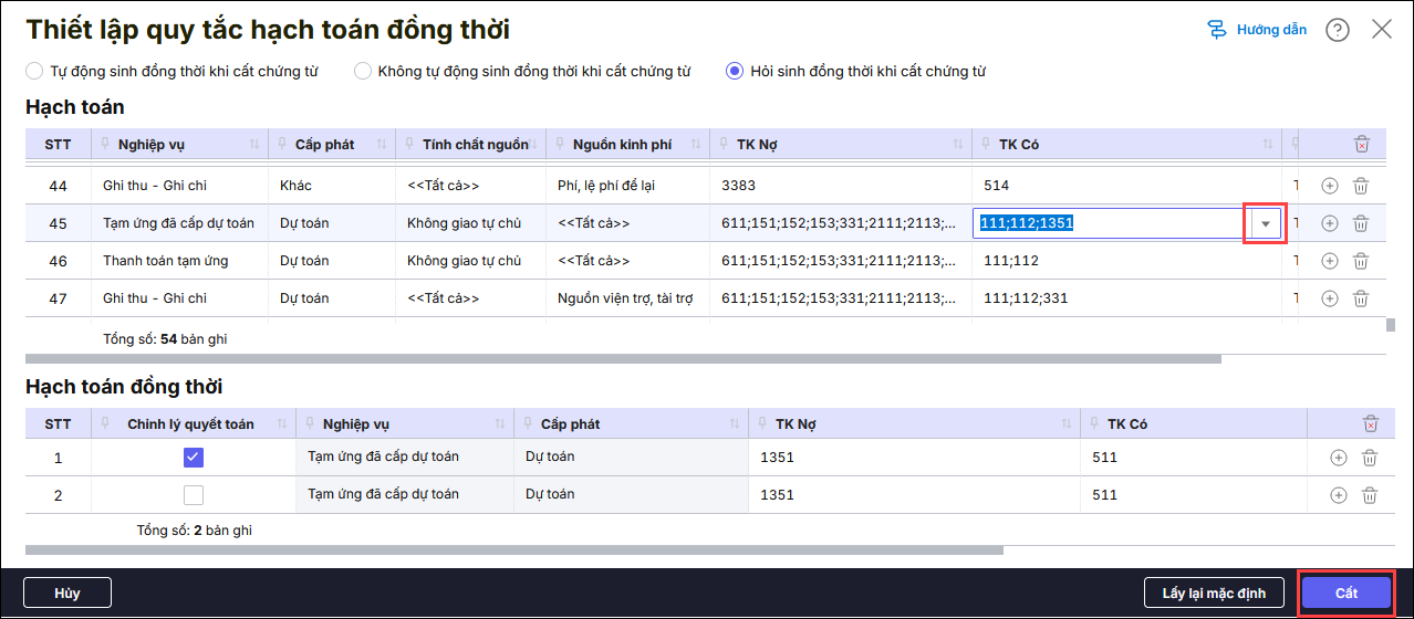 Bước 2: Tại dòng 45, thiết lập cho nghiệp vụ Tạm ứng đã cấp dự toán, cấp phát Dự toán, tính chất nguồn Không giao tự chủ, Nguồn kinh phí <<Tất cả>>, TK Nợ 611, TK có 111, 112 nhấn vào ô tại cột TK có chọn vào hình tam giác (⏷) thêm TK 1351 -> Nhấn Cất