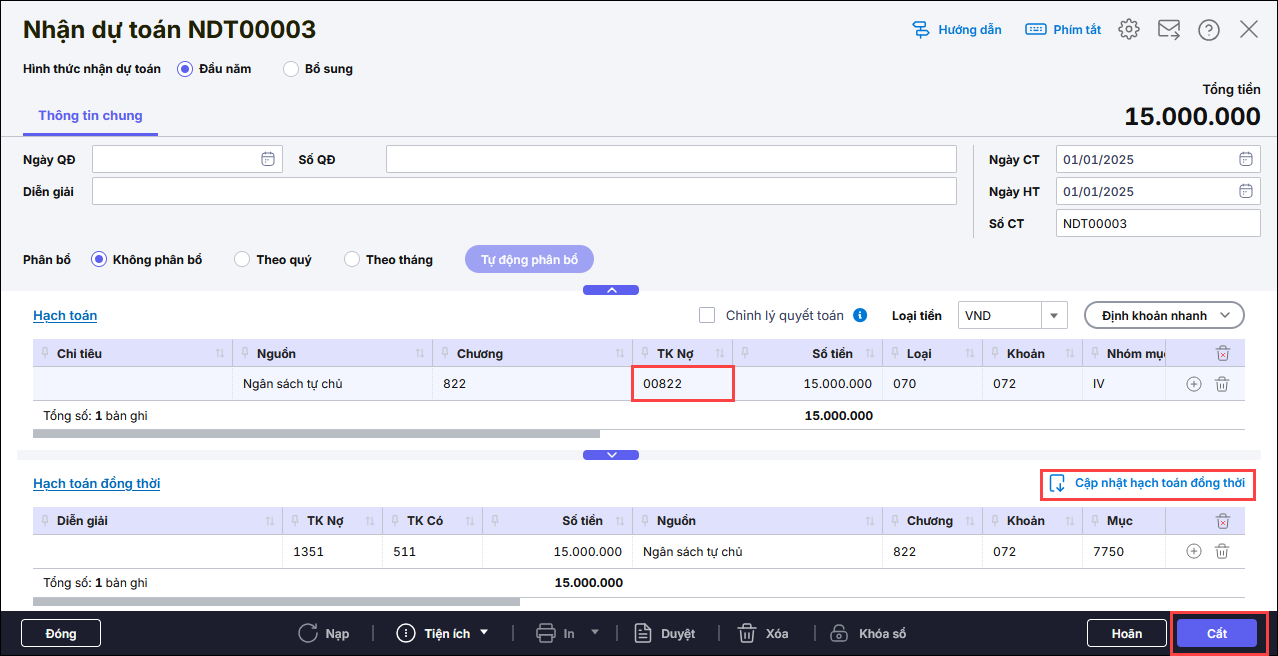 Vào lại các chứng từ Nhận dự toán và Điều chỉnh dự toán của nguồn giao tự chủ kiểm tra đã hạch toán đúng Nợ TK 00822 chưa và nhấn Cập nhật hạch toán đồng thời.