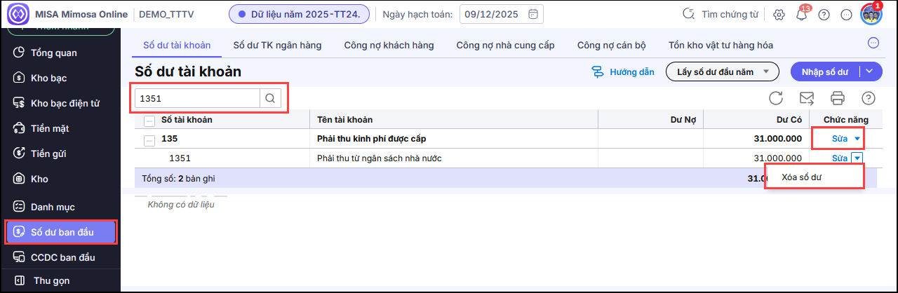 Nếu không còn số dư nào nhưng vẫn hiển thị có số dư TK 1351 thì thực hiện nhấn vào hình tam giác (⏷) ở bên cạnh chức năng Sửa, nhấn Xóa số dư, nhấn Xóa