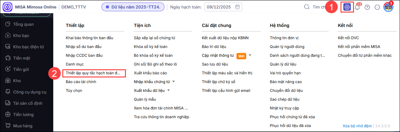Bước 1: Vào biểu tượng Bánh răng ⚙ (góc phải phía trên)Thiết lập\Thiết lập quy tắc hạch toán đồng thời.