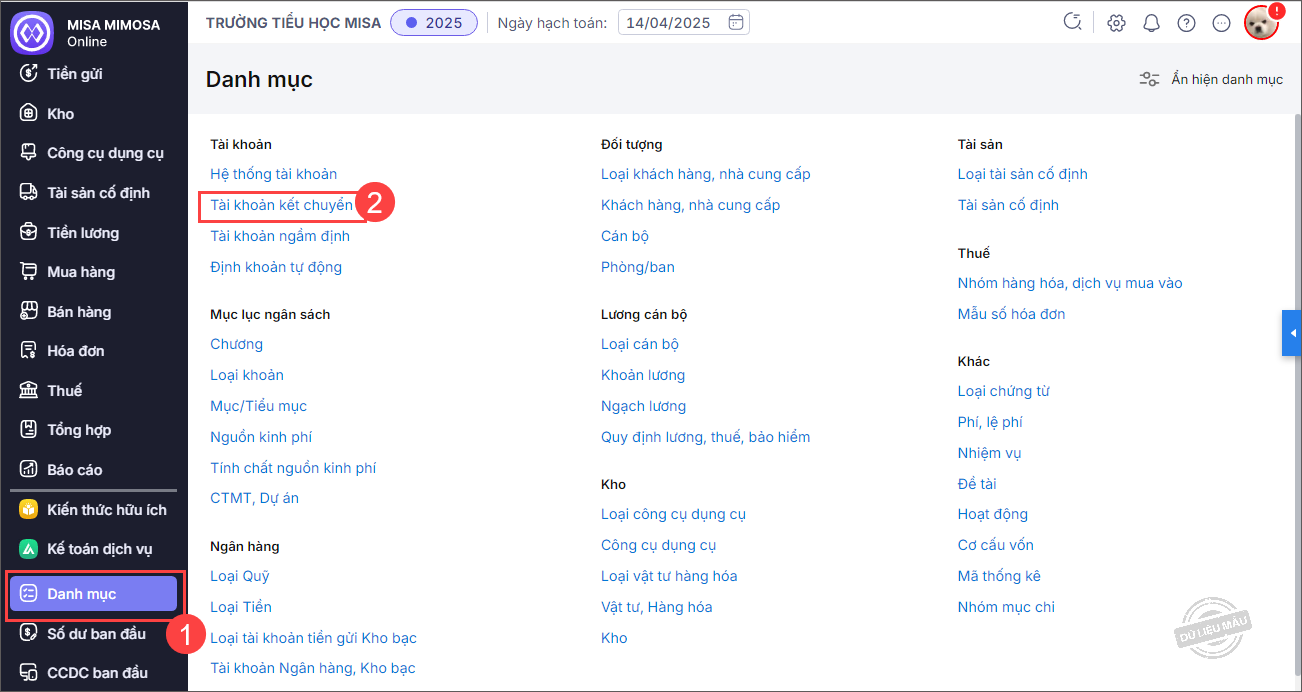Bước 1: Chọn menu Danh mục\Tài khoản kết chuyển.