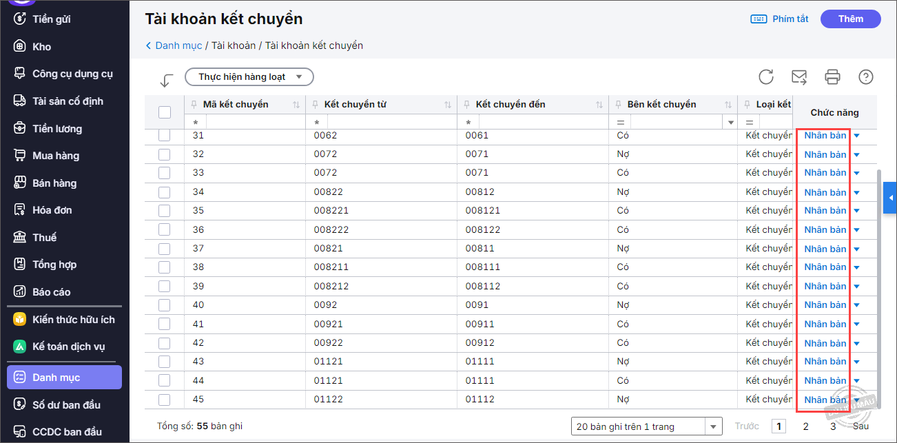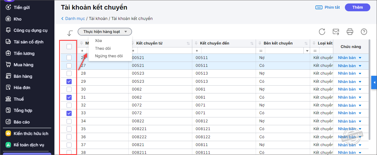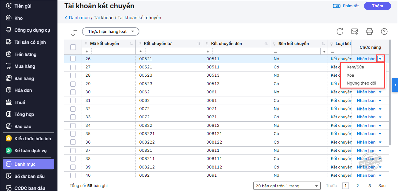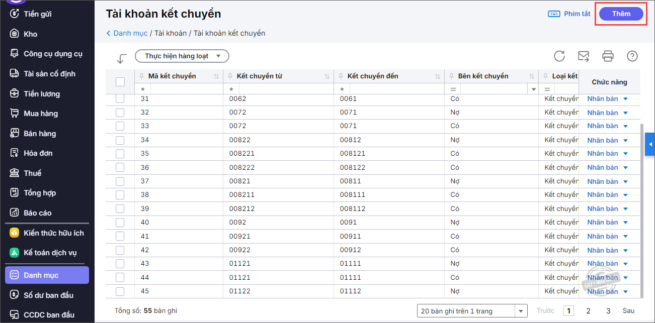 Bước 2: Để thêm mới tài khoản kết chuyển, nhấn Thêm.