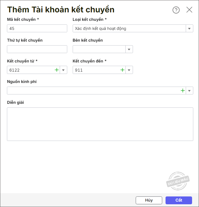 - Mã kết chuyển: Mã của tài khoản kết chuyển (không được trùng với mã đã tồn tại trên hệ thống)