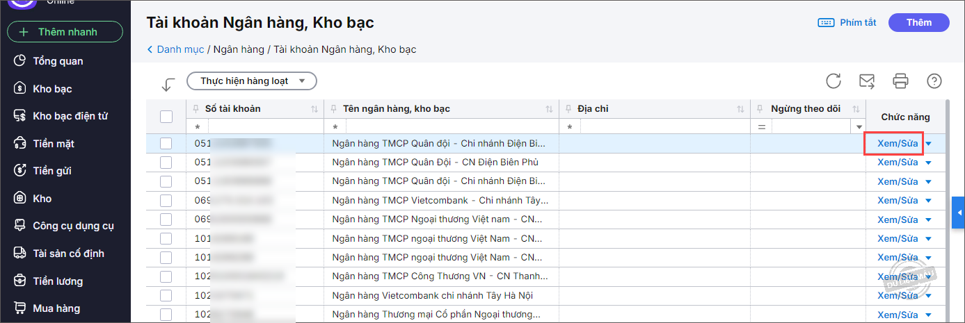 Bước 2: Tại danh sách tài khoản, tìm đến tài khoản cần sửa và nhấn Xem/Sửa (hoặc kích đúp chuột vào dòng đó).