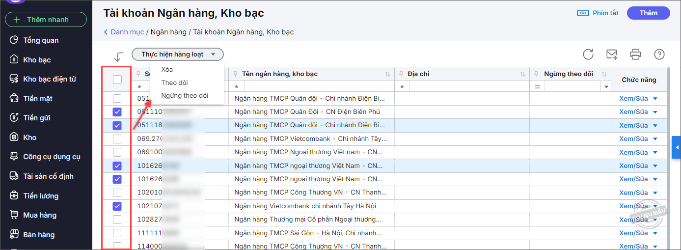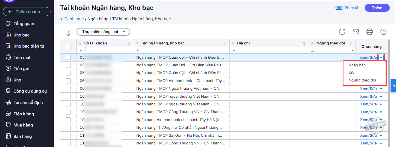 - Bài viết nhằm hướng dẫn bạn quản lý danh mục (Thêm mới, Sửa, Xóa, và Ngừng theo dõi /Theo dõi) các Tài khoản ngân hàng, Tài khoản kho bạc (tài khoản chi) của đơn vị