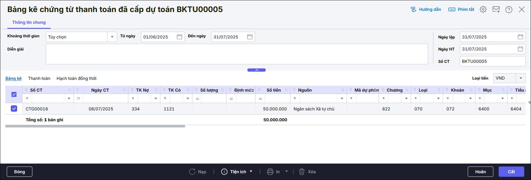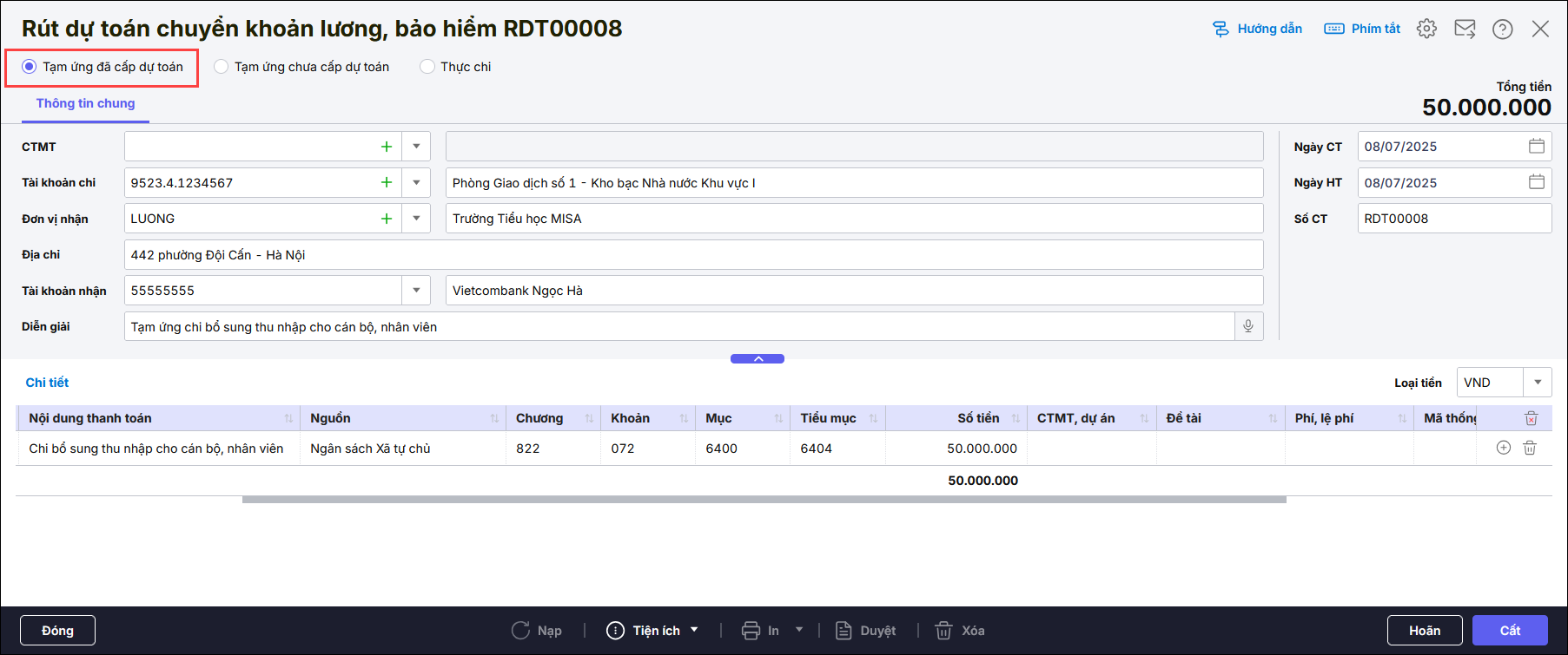 Lưu ý: Nghiệp vụ tích chọn Tạm ứng đã cấp dự toán.