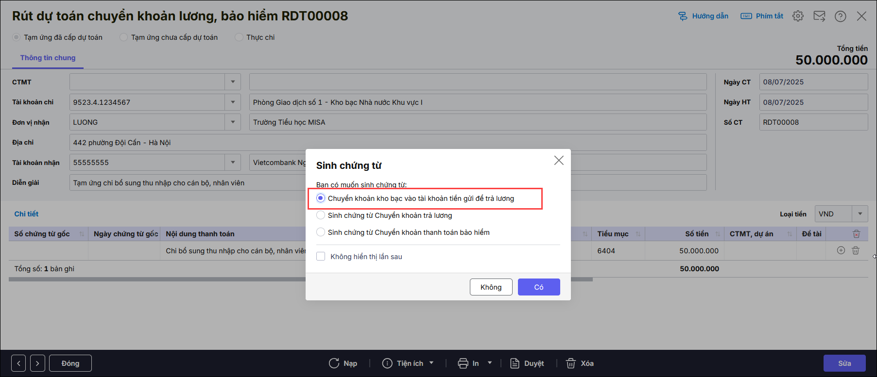- Nhấn Cất. Hệ thống hiển thị màn hình thông báo sinh chứng từ Chuyển khoản kho bạc vào tài khoản tiền gửi để trả lương. Nhấn Có.