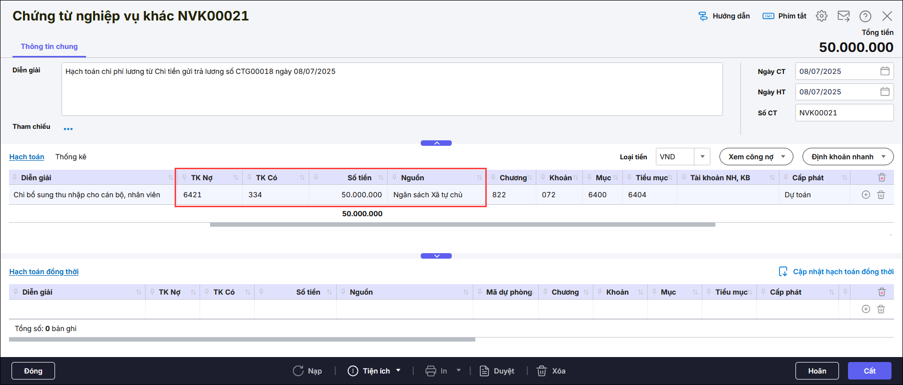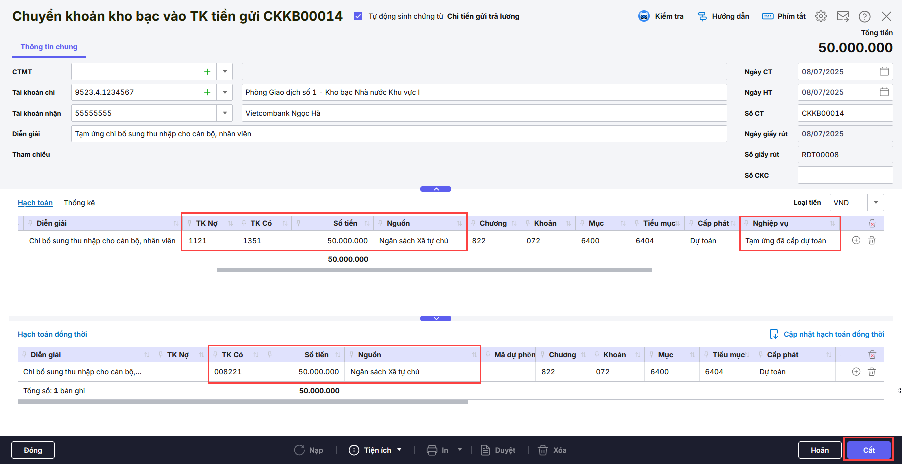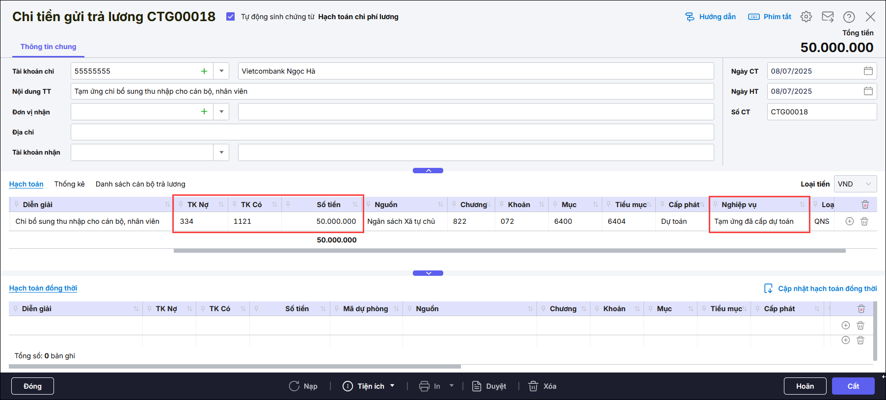 - Hạch toán TK Nợ 334, Có TK 1121, nghiệp vụ Tạm ứng đã cấp dự toán. Nhấn Cất.