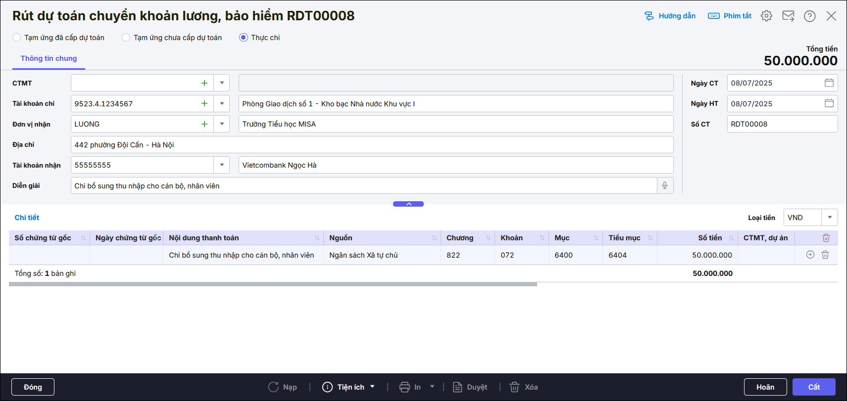 - Hạch toán TK Nợ 334, Có TK 1121, nghiệp vụ Thực chi.