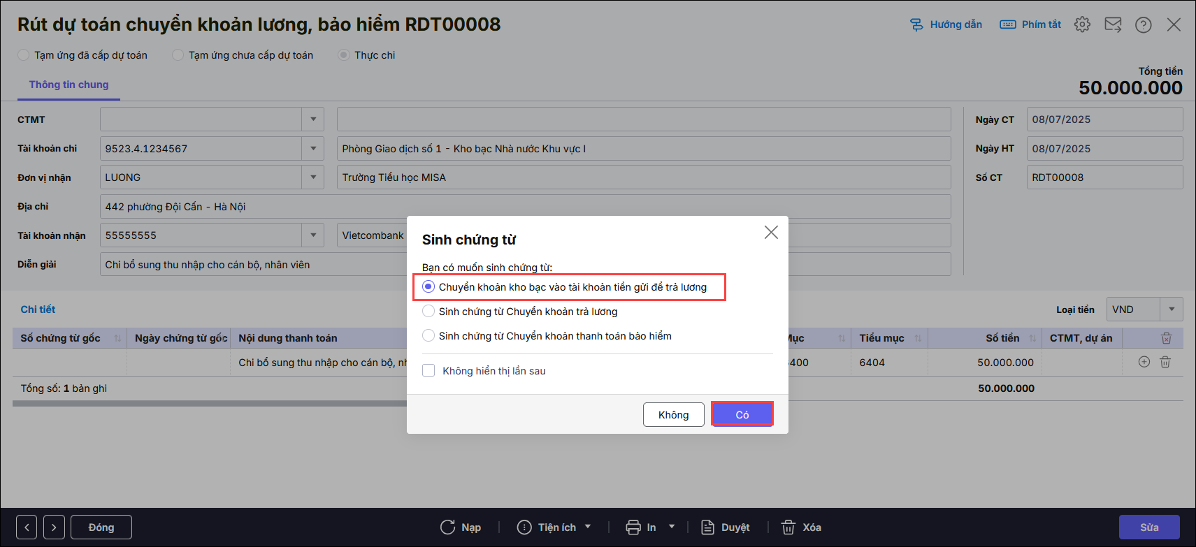 - Hệ thống hiển thị màn hình thông báo sinh chứng từ Chuyển khoản kho bạc vào tài khoản tiền gửi để trả lương. Nhấn Có.