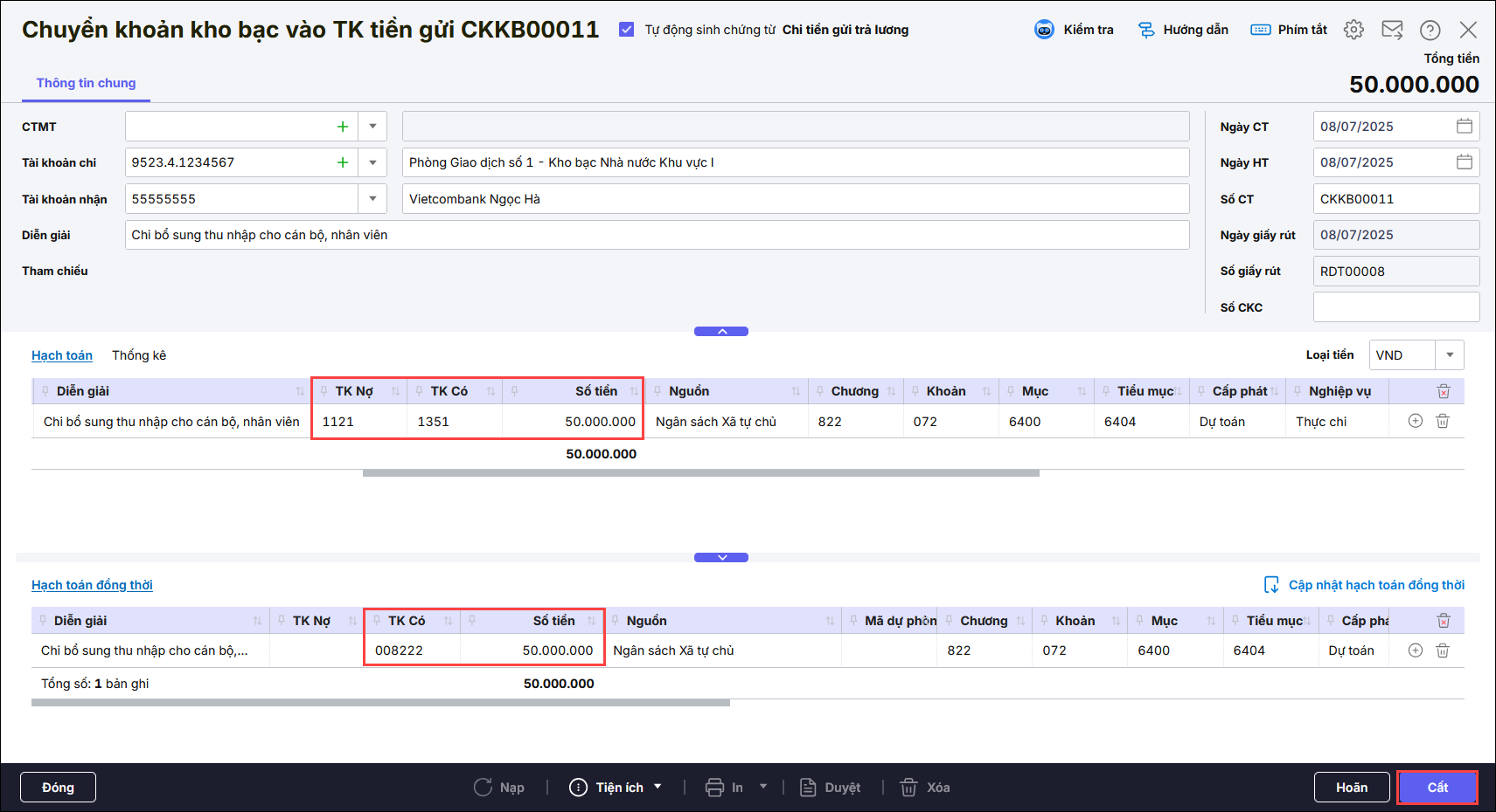 - Bạn kiểm tra các thông tin trên chứng từ Chuyển khoản kho bạc vào TK tiền gửi, phần mềm đã tự sinh hạch toán Nợ TK 1121, Có TK 1351 – Nghiệp vụ Thực chi, dựa theo tính chất nguồn kinh phí, đồng thời Có TK 008222 tương ứng. Nhấn Cất.
