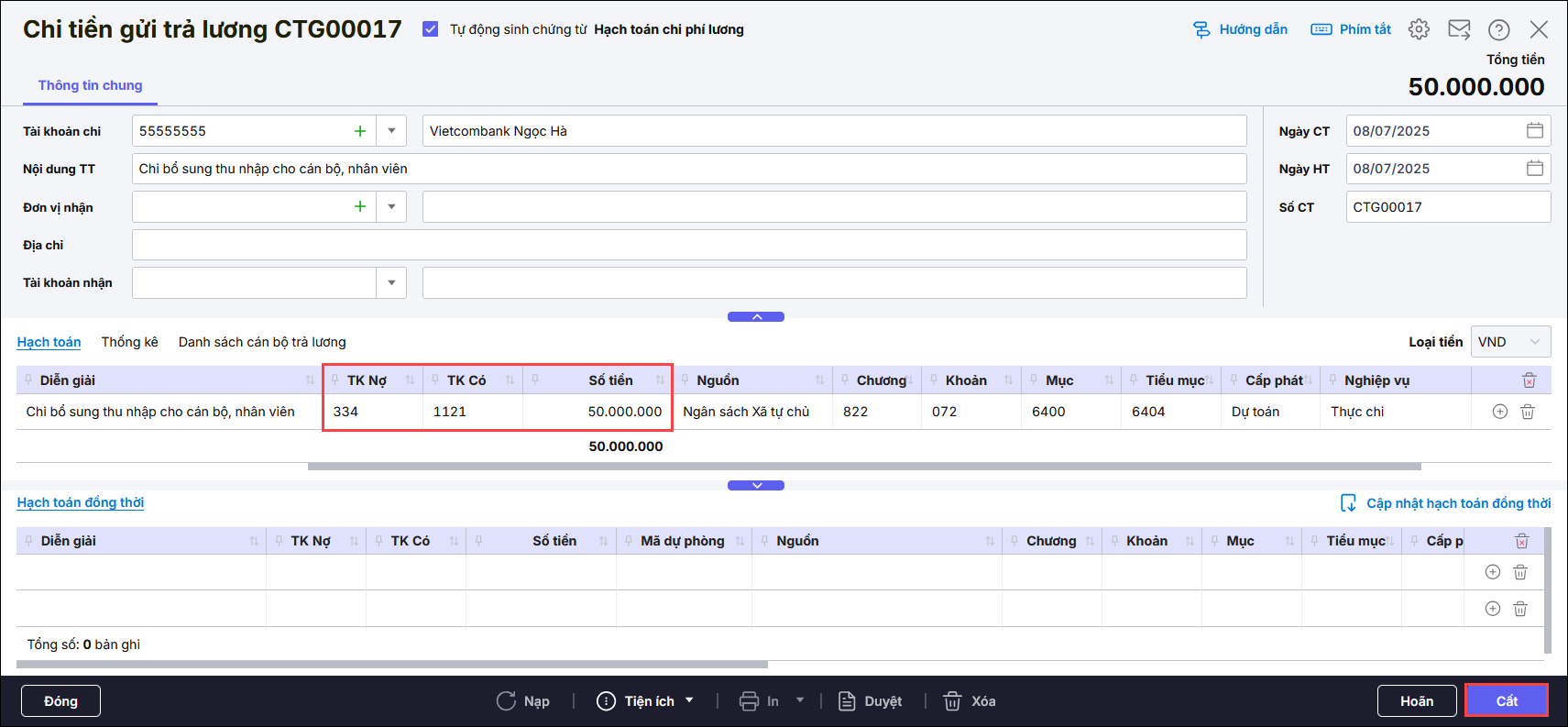 - Nhấn Cất ở Bước 1 phần mềm tự động sinh chứng từ chi tiền gửi trả lương.