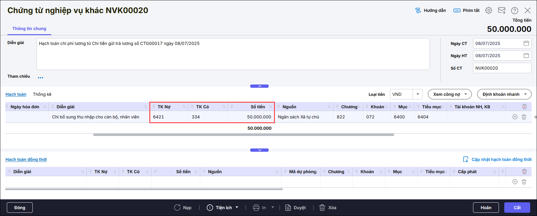 Bước 2: Chi bổ sung thu nhập vào phiếu chi tiền mặt hoặc ủy nhiệm chi