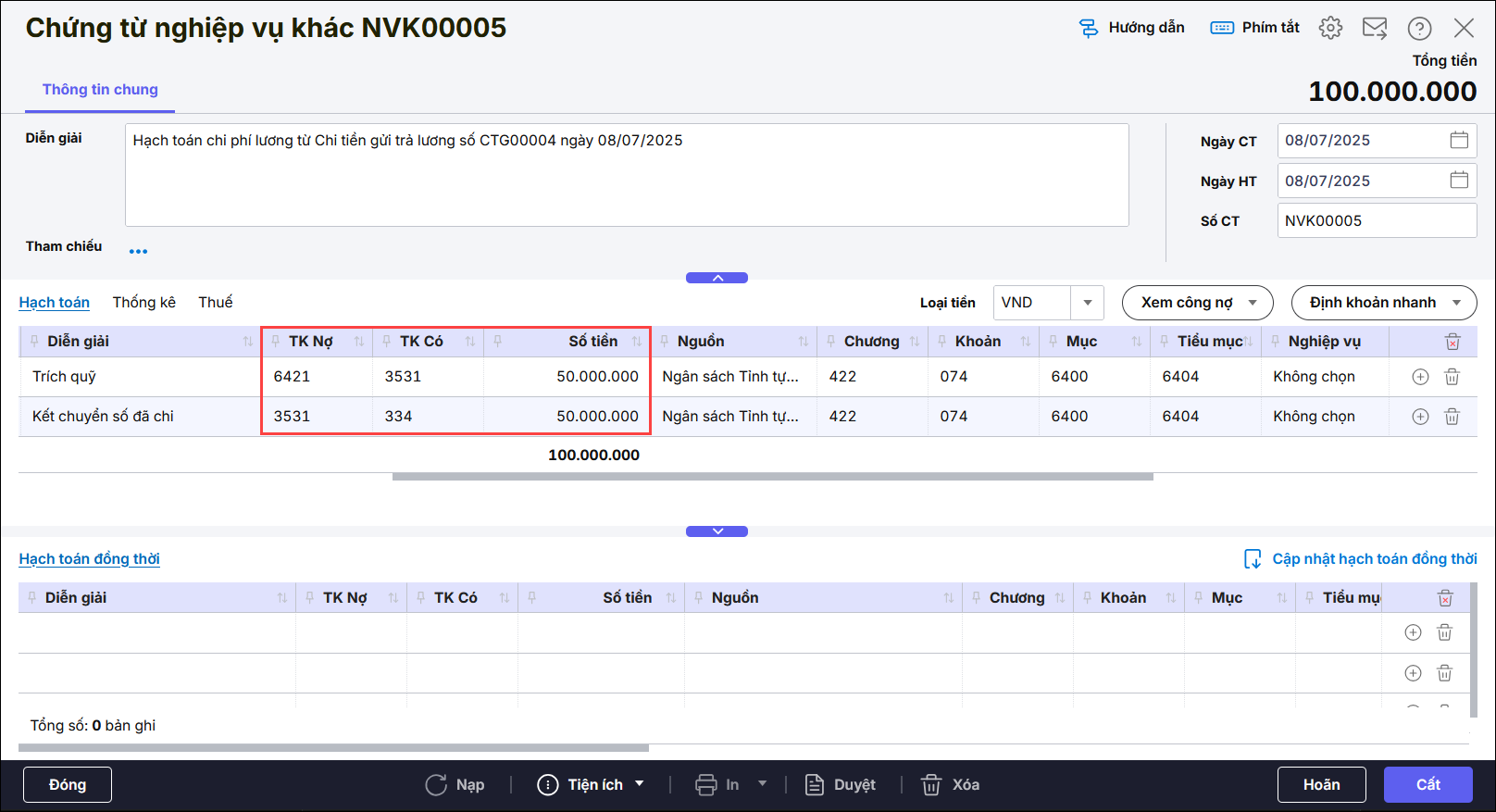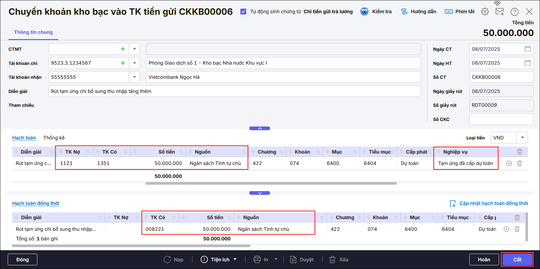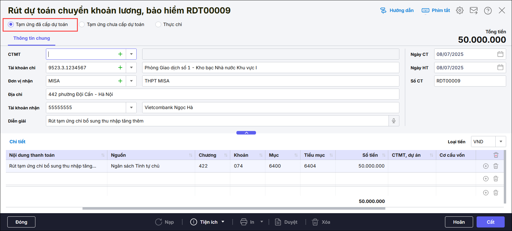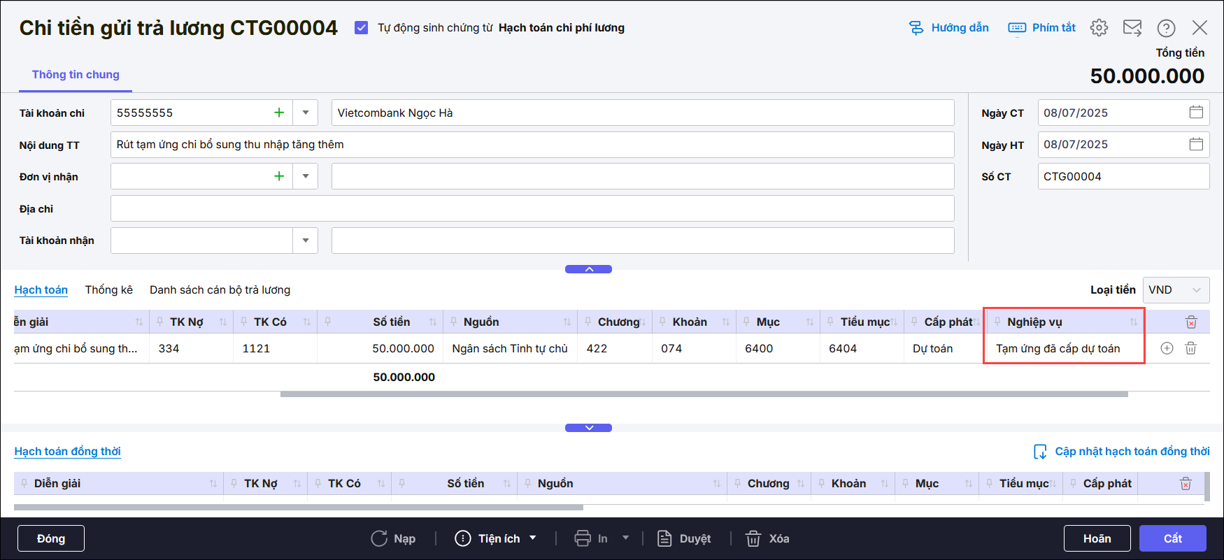 - Hạch toán TK Nợ 334, Có TK 1121, nghiệp vụ Tạm ứng đã cấp dự toán. Nhấn Cất.