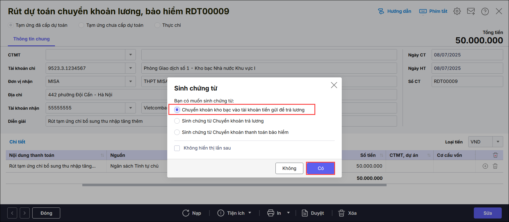 Bước 3: Nhấn Cất. Hệ thống hiển thị màn hình thông báo sinh chứng từ Chuyển khoản kho bạc vào tài khoản tiền gửi để trả lương. Nhấn Có.