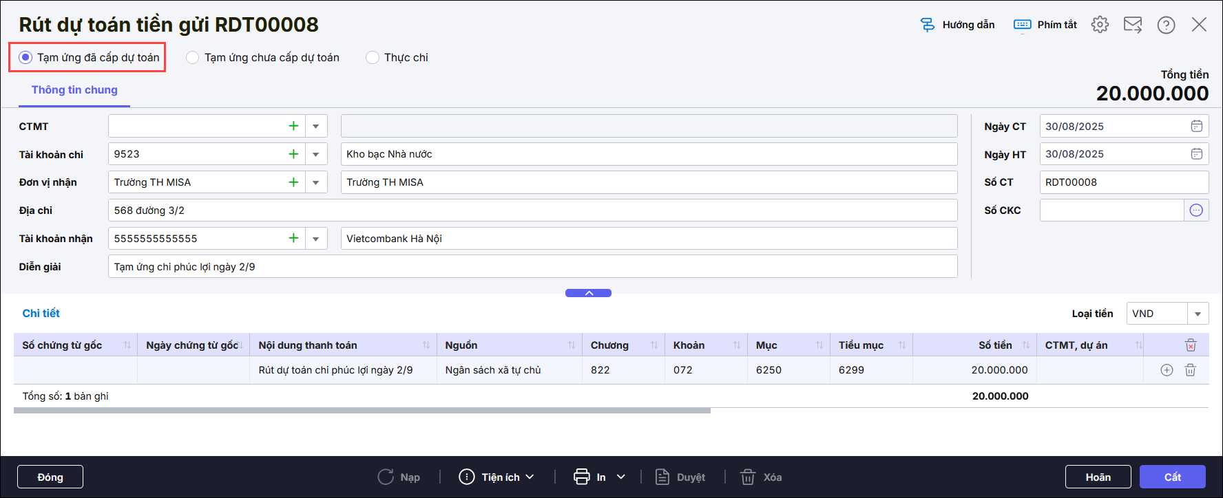 - Chọn nghiệp vụ Tạm ứng đã cấp dự toán