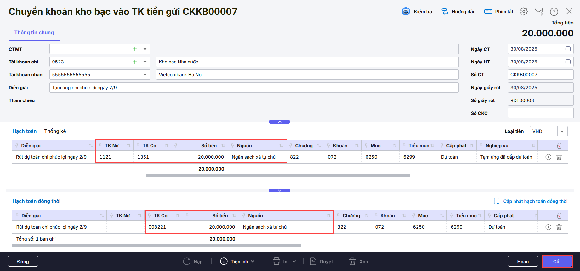 4. Bạn các thông tin trên chứng từ Chuyển khoản kho bạc vào TK tiền gửi, phần mềm đã tự sinh hạch toán Nợ TK 1121/Có TK 1351 – nghiệp vụ Tạm ứng đã cấp dự toán dựa theo tính chất nguồn KP đồng thời Có TK 008221 tương ứng.