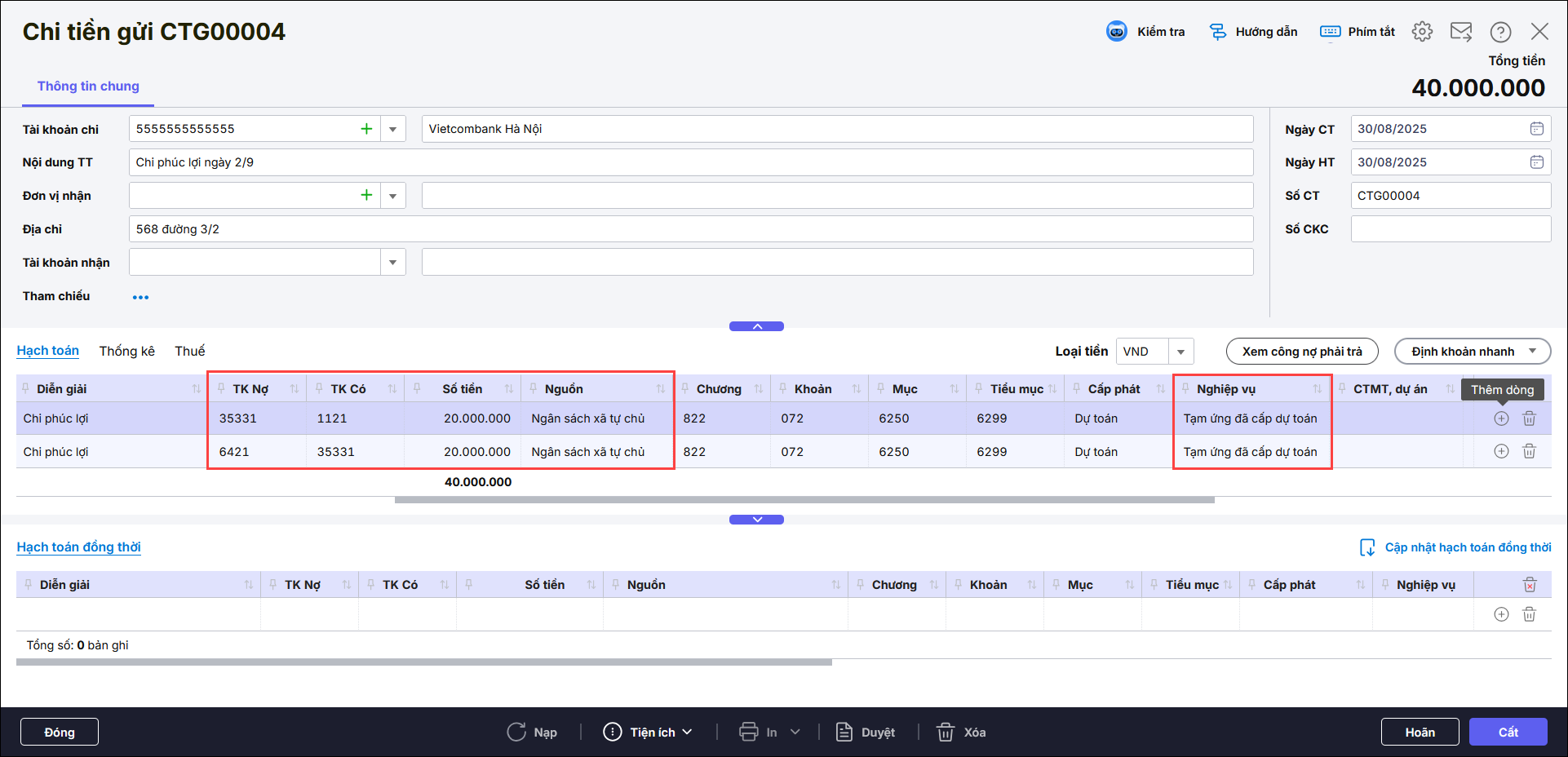 Lưu ý: Nghiệp vụ tích chọn Tạm ứng đã cấp dự toán