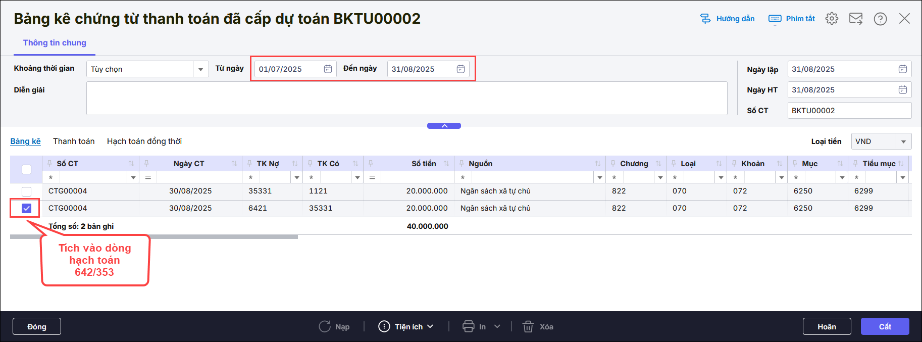 - Lưu ý: Tích chọn các dòng chứng từ hạch toán Nợ TK 642/Có TK 353 để thanh toán