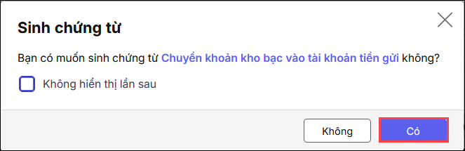 3. Nhấn Cất. Hệ thống hiển thị màn hình thông báo sinh chứng từ Chuyển khoản kho bạc vào tài khoản tiền gửi. Nhấn Có.