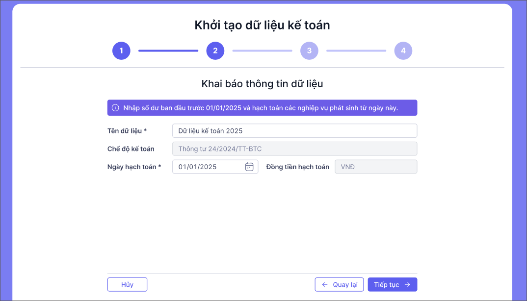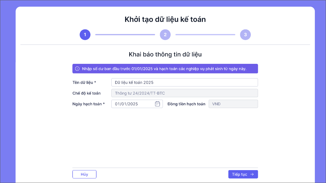 - Ngày hạch toán mặc định là ngày đầu năm của năm hiện tại. Ví dụ năm hiện tại là năm 2025 thì ngày hạch toán mặc định là 1/1/2025. Nếu anh/chị muốn nhập dữ liệu từ năm nào, thời điểm nào thì sửa lại ngày hạch toán từ năm, thời điểm tương ứng.