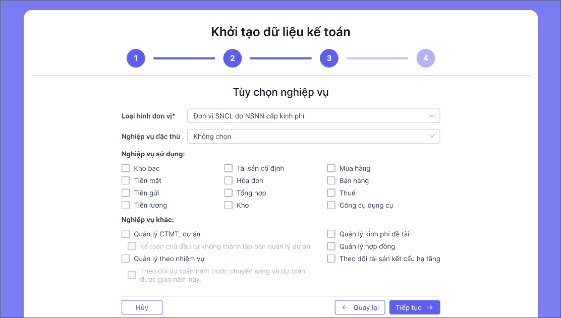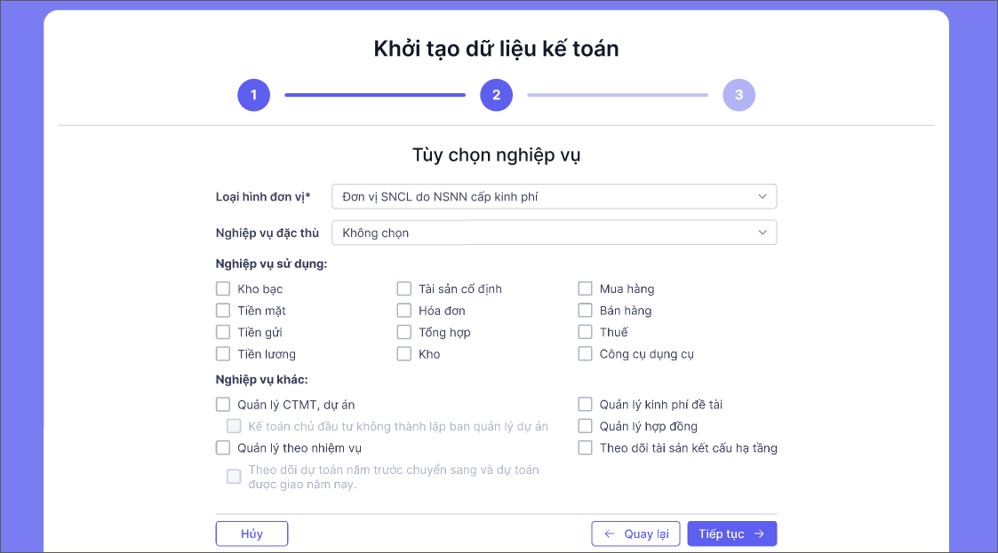 – Phần mềm sẽ căn cứ trên Loại hình đơn vị theo thông tin người dùng đã khai báo ban đầu để tự động tích chọn sẵn các nghiệp vụ sử dụng. Anh/chị có thể chọn lại (nếu cần).