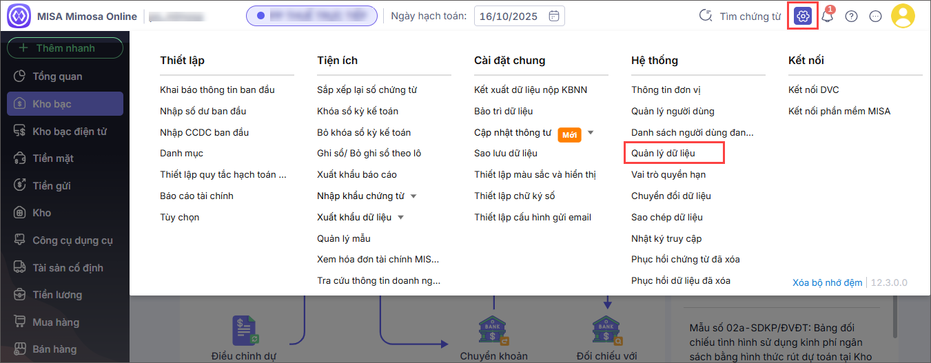 - Vào biểu tượng Bánh răng ⚙ (góc phải phía trên) chọn Quản lý dữ liệu.