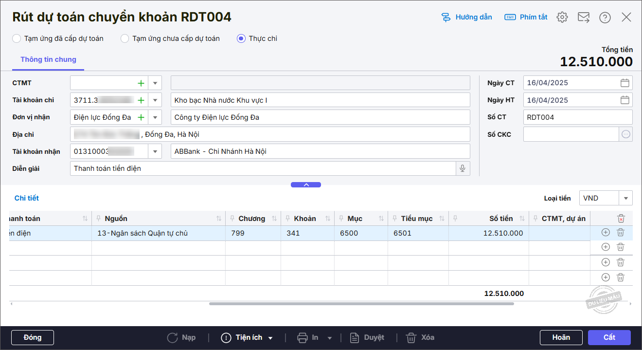 • Tài khoản chi: lựa chọn hoặc khai báo thêm tài khoản ngân hàng, kho bạc.