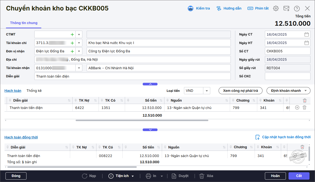 Bước 4: Anh/chị kiểm tra các thông tin trên chứng từ Chuyển khoản kho bạc, phần mềm sinh hạch toán dựa vào nguồn phát sinh. Tuỳ vào nghiệp vụ thực tế tại đơn vị để chỉnh sửa bút toán hạch toán cho phù hợp. Nhấn Cất.