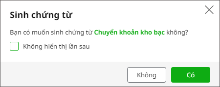 4. Nhấn Cất. Hệ thống hiển thị màn hình thông báo Bạn có muốn sinh chứng từ Chuyển khoản kho bạc không? Nhấn Đồng ý.