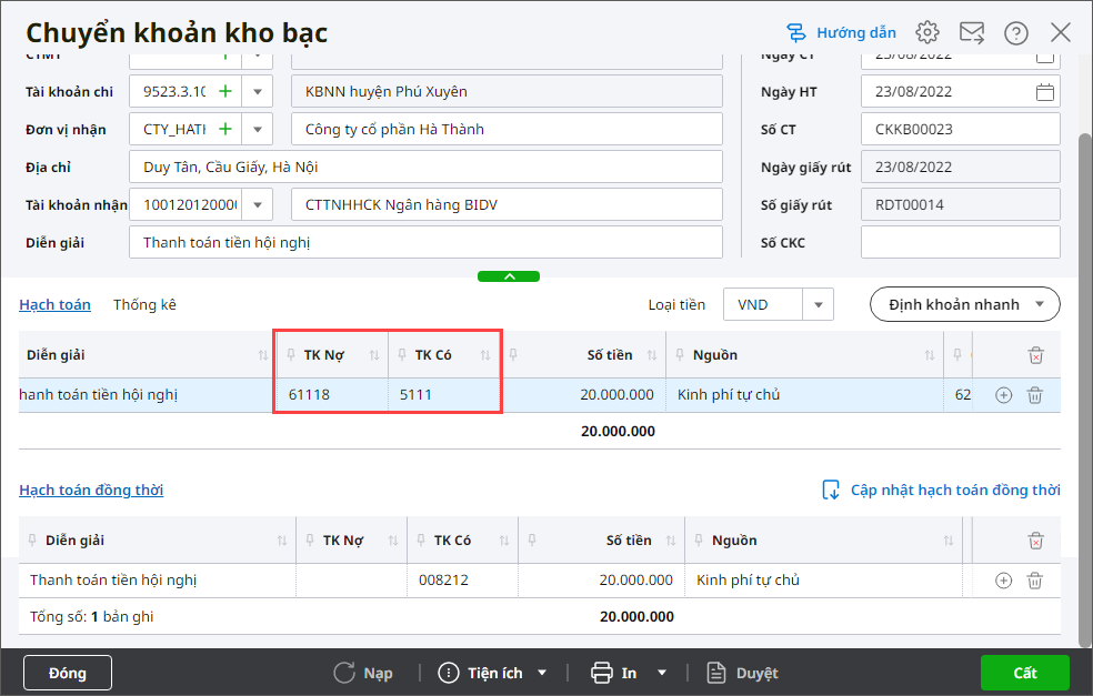 5. Anh/chị kiểm tra các thông tin trên chứng từ Chuyển khoản kho bạc, phần mềm mặc định sinh TK Nợ 61111, TK Có 5111 hoặc TK Nợ 61121, TK Có 5112 theo tính chất nguồn KP, nghiệp vụ Thực chi, đồng thời sinh bút toán hạch toán đồng thời ghi Có TK 008212 hoặc Có TK 008222. Tuỳ vào nghiệp vụ thực tế tại đơn vị để chỉnh sửa bút toán hạch toán cho phù hợp.