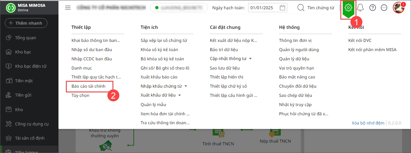 2.1. Thiết lập công thức báo cáoBước 1: Vào ⚙ Thiết lập\Báo cáo tài chính.
