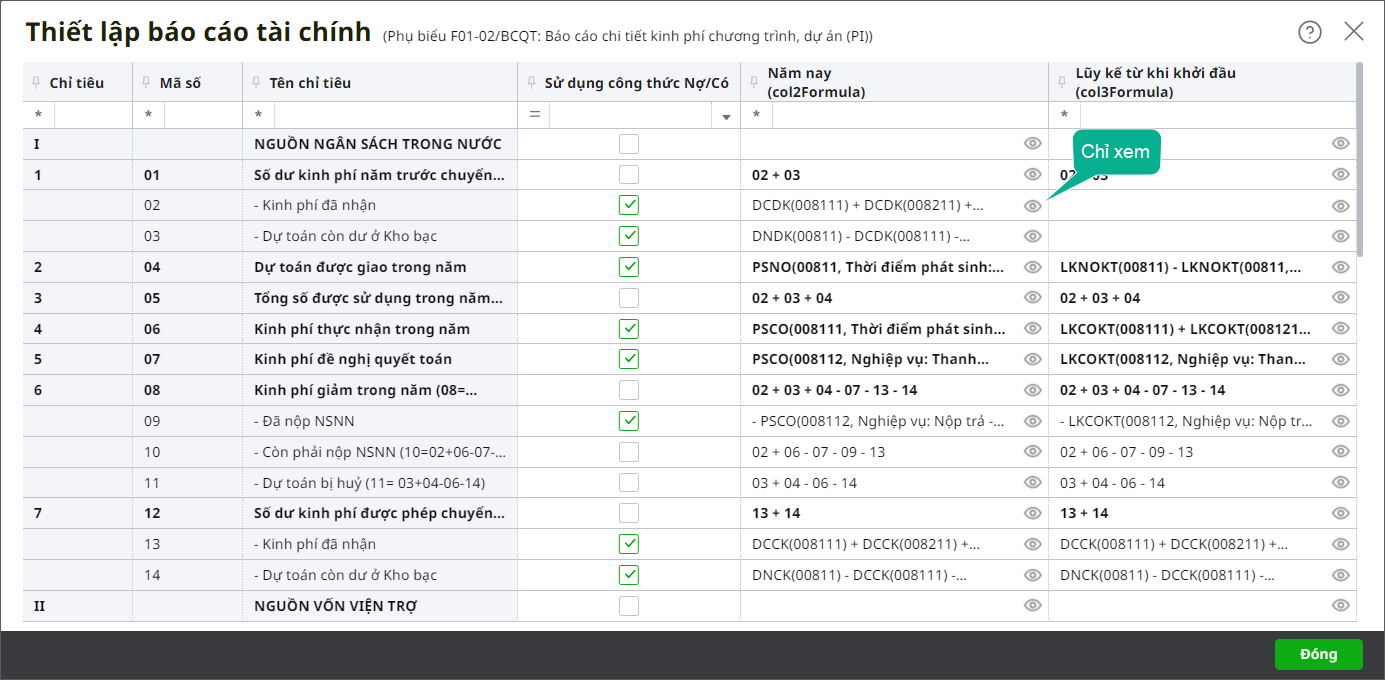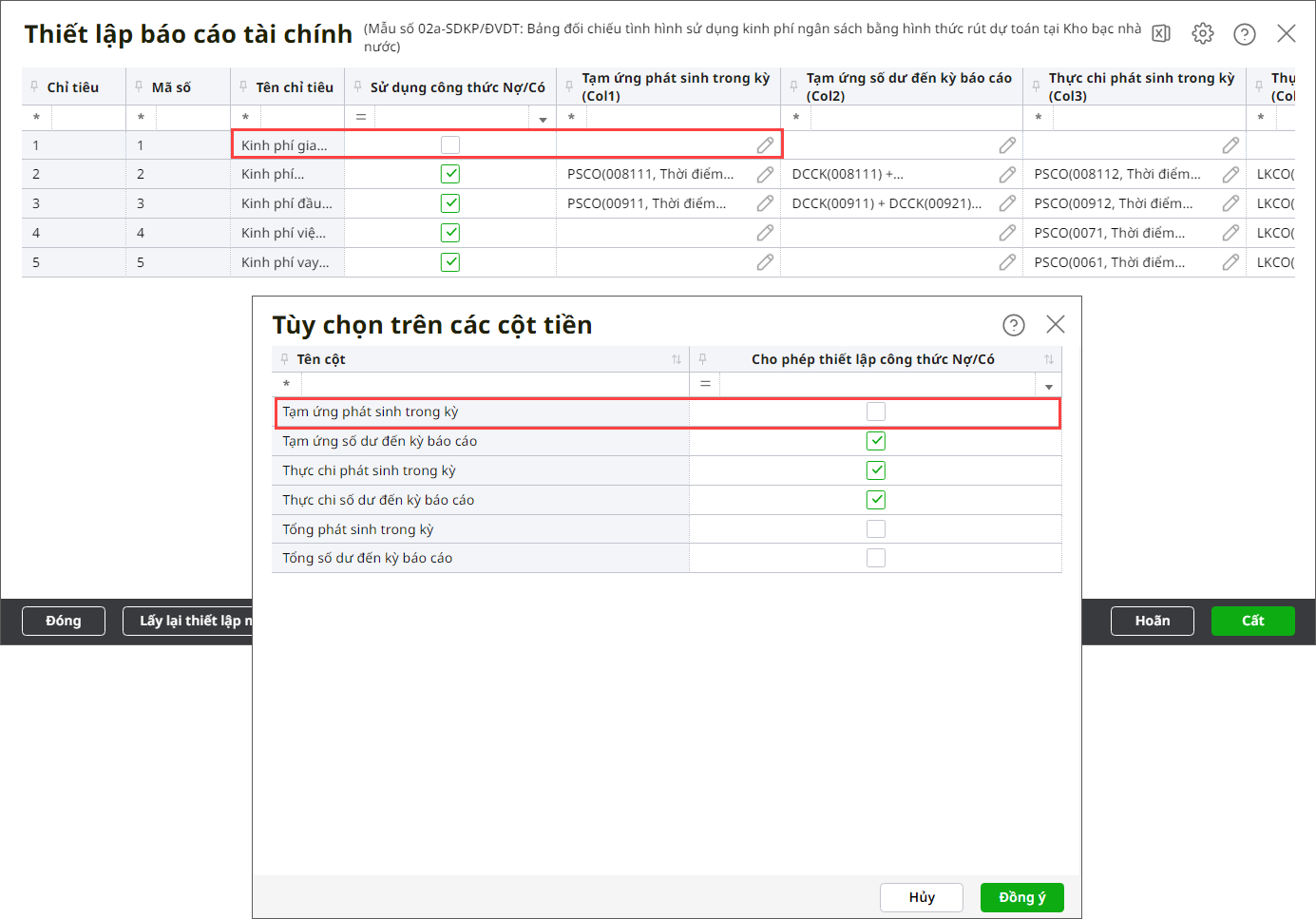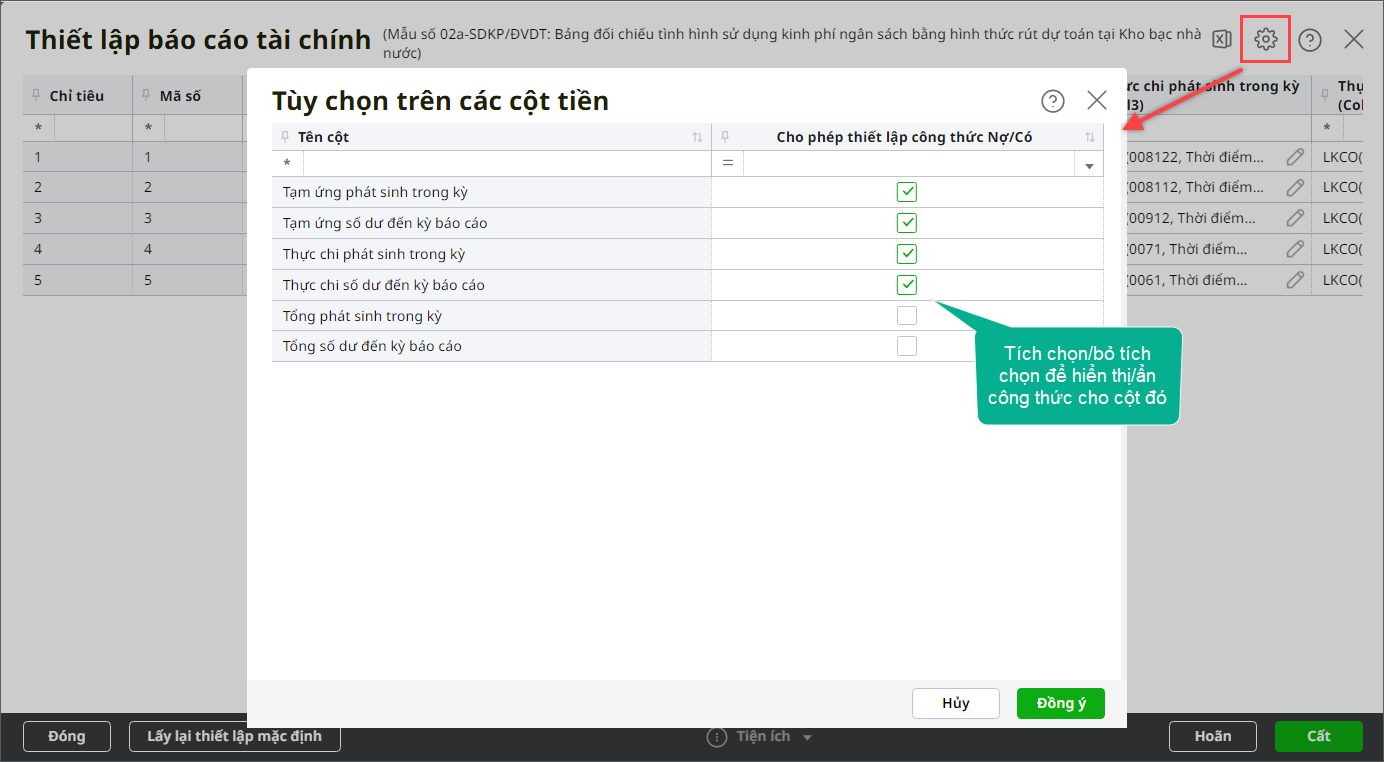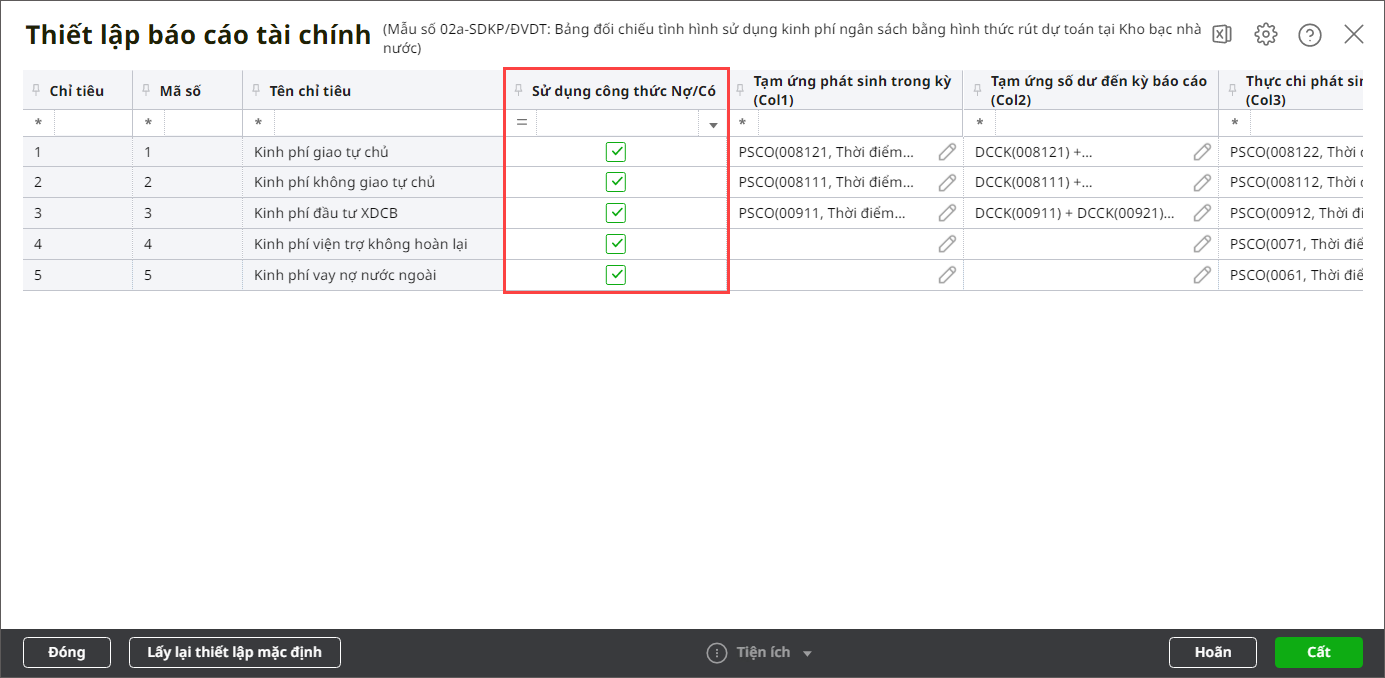 Bước 4: Tích chọn Sử dụng công thức Nợ/Có tại chỉ tiêu nào thì hệ thống sẽ hiển thị công thức của các dòng thuộc chỉ tiêu đó. Ngược lại nếu không tích chọn thì sẽ ẩn công thức của dòng thuộc cột được tích chọn tại bước 4 (dòng thuộc cột không được tích chọn tại bước 4 thì vẫn hiển thị công thức).