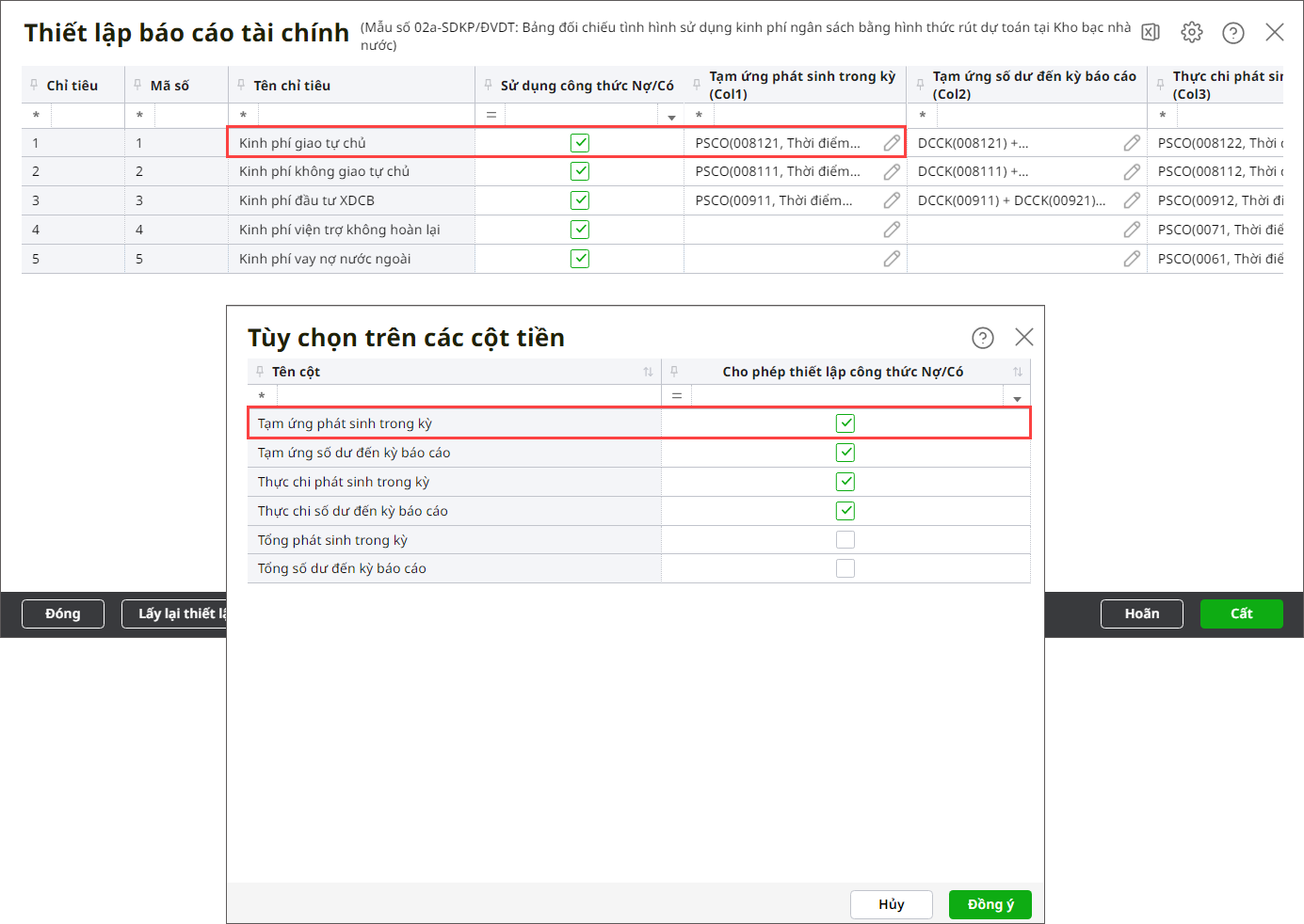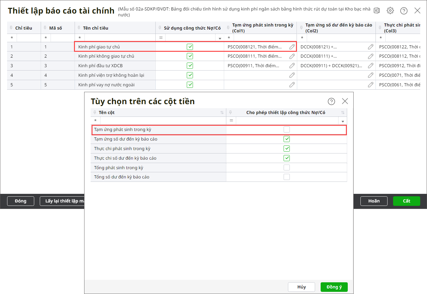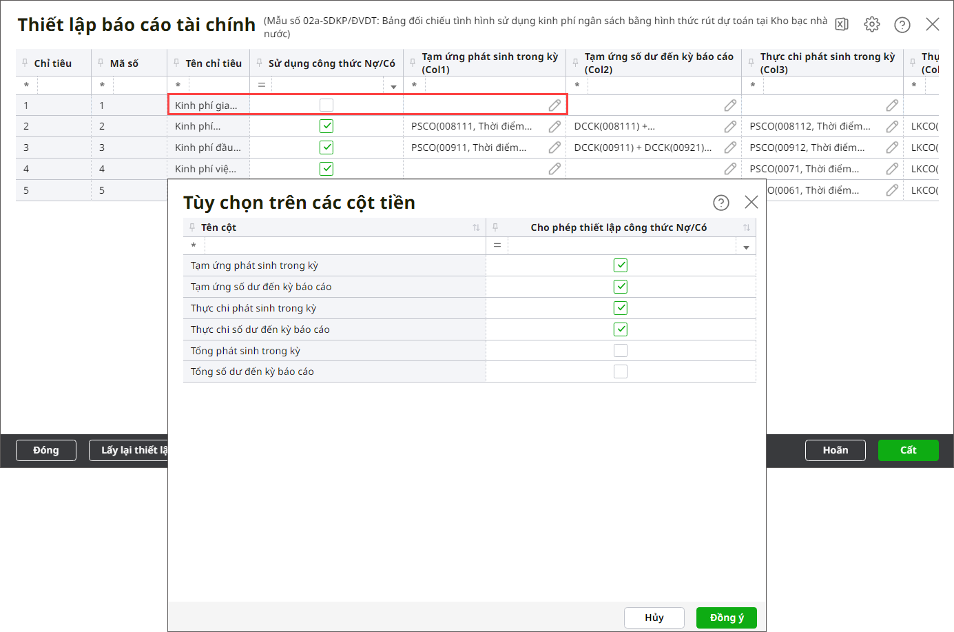 Bước 4: Tích chọn Sử dụng công thức Nợ/Có tại chỉ tiêu nào thì hệ thống sẽ hiển thị công thức của các dòng thuộc chỉ tiêu đó. Ngược lại nếu không tích chọn thì sẽ ẩn công thức của dòng thuộc cột được tích chọn tại bước 4 (dòng thuộc cột không được tích chọn tại bước 4 thì vẫn hiển thị công thức).