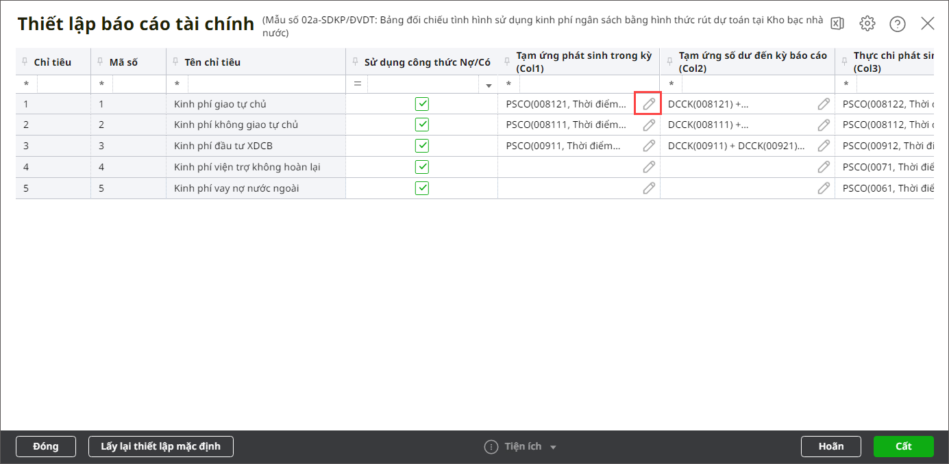 Bước 5: Để sửa công thức cho chỉ tiêu nào thì nhấn biểu tượng Sửa tại phần công thức chi tiết đó. Ví dụ: Sửa công thức Tạm ứng phát sinh trong kỳ của chỉ tiêu Kinh phí giao tự chủ.