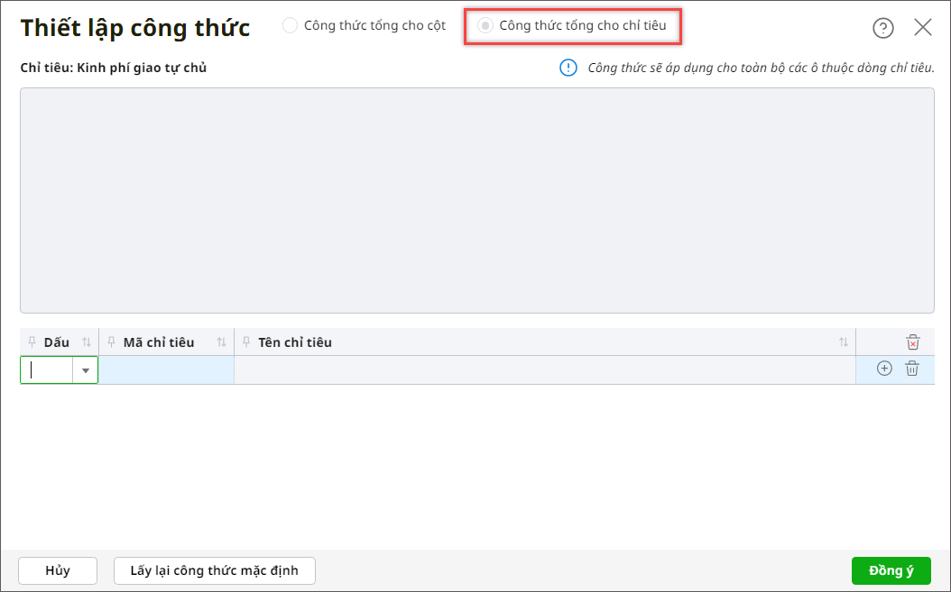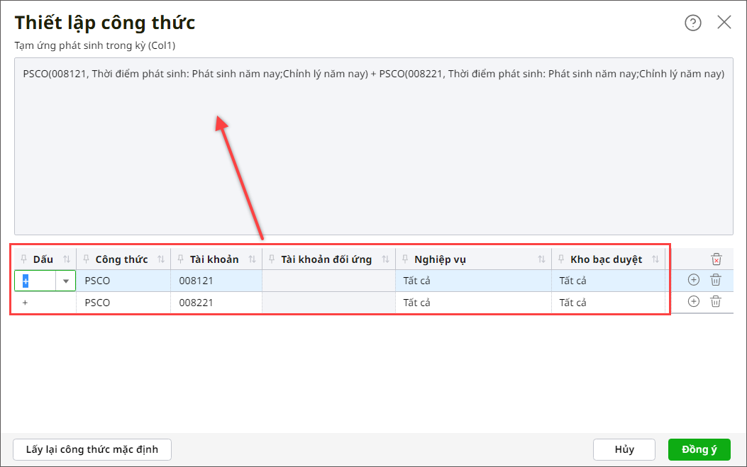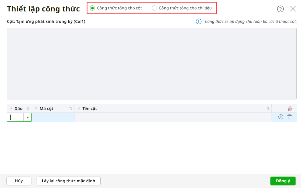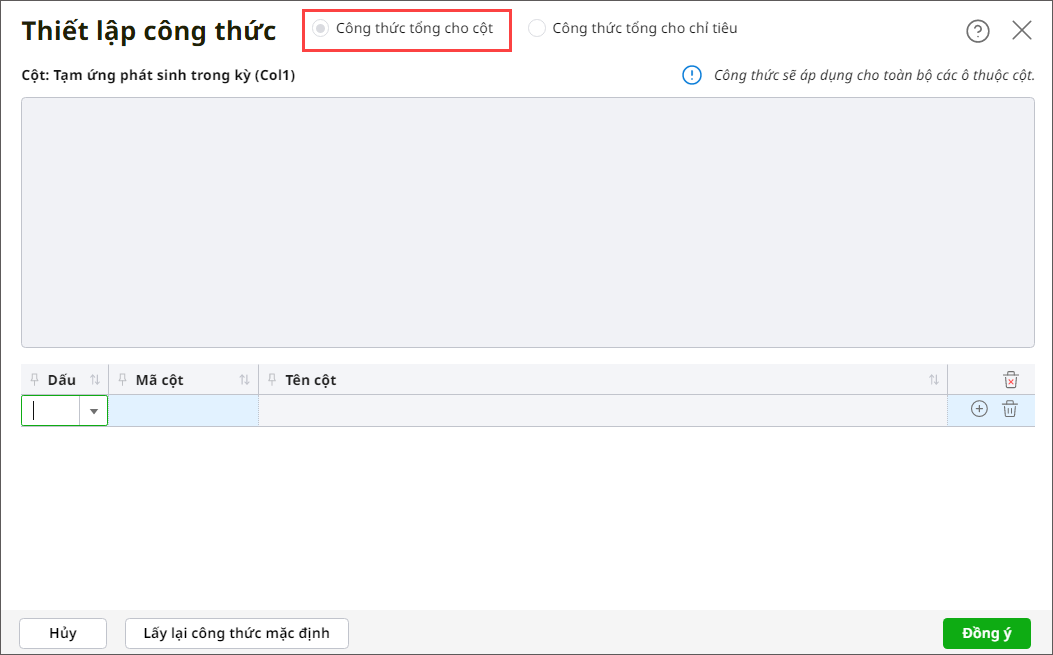 – Trường hợp 4: Nếu dòng tích chọn Sử dụng công thức Nợ/Có, cột không tích chọn