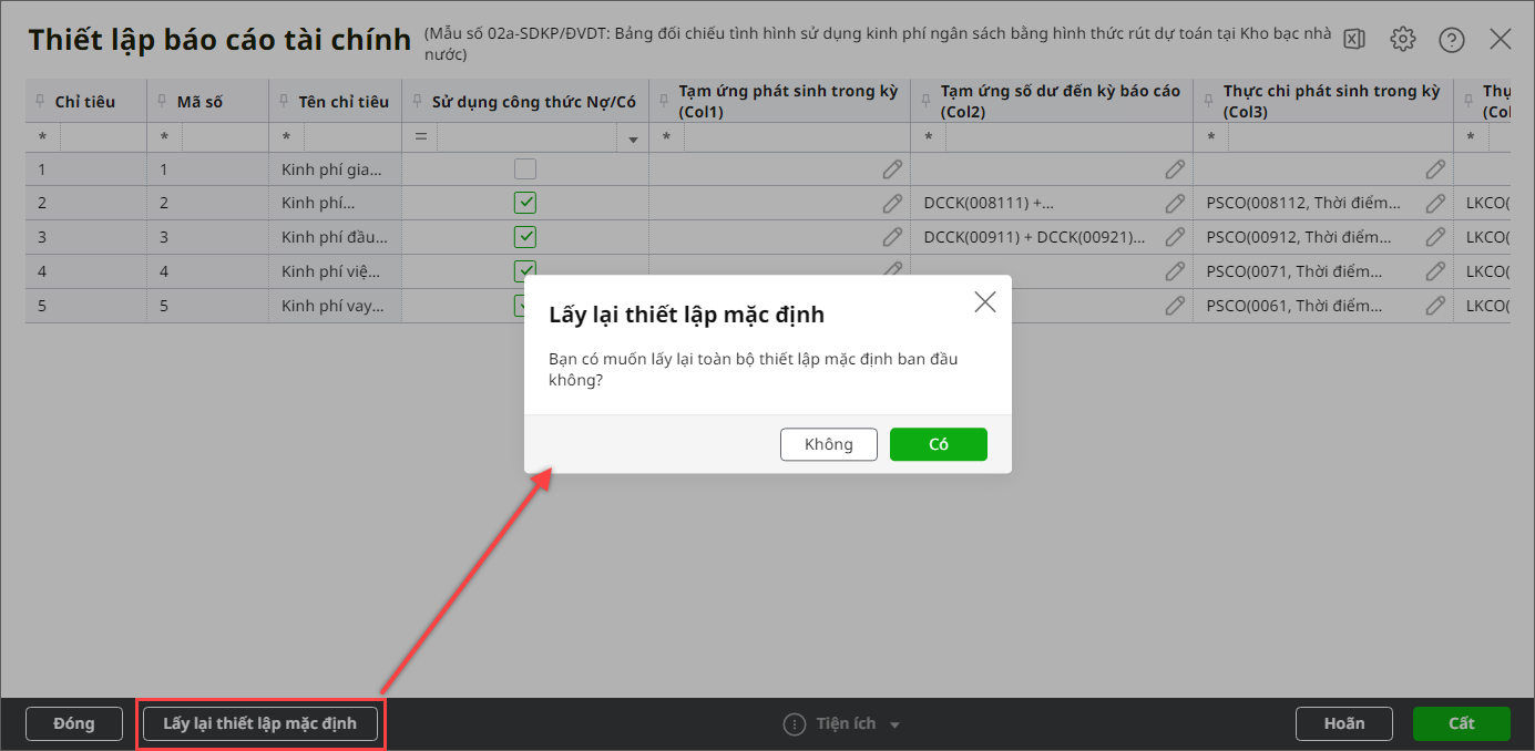 Bước 6: Trường hợp muốn lấy lại công thức mặc định của chương trình thì nhấn Lấy lại thiết lập mặc định.