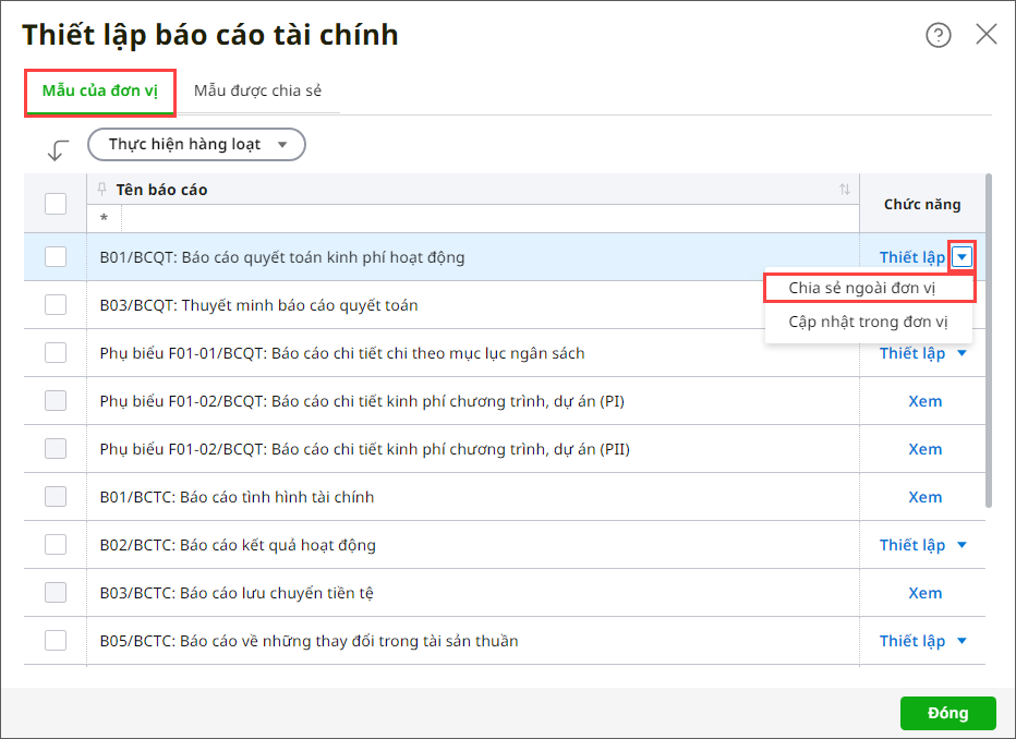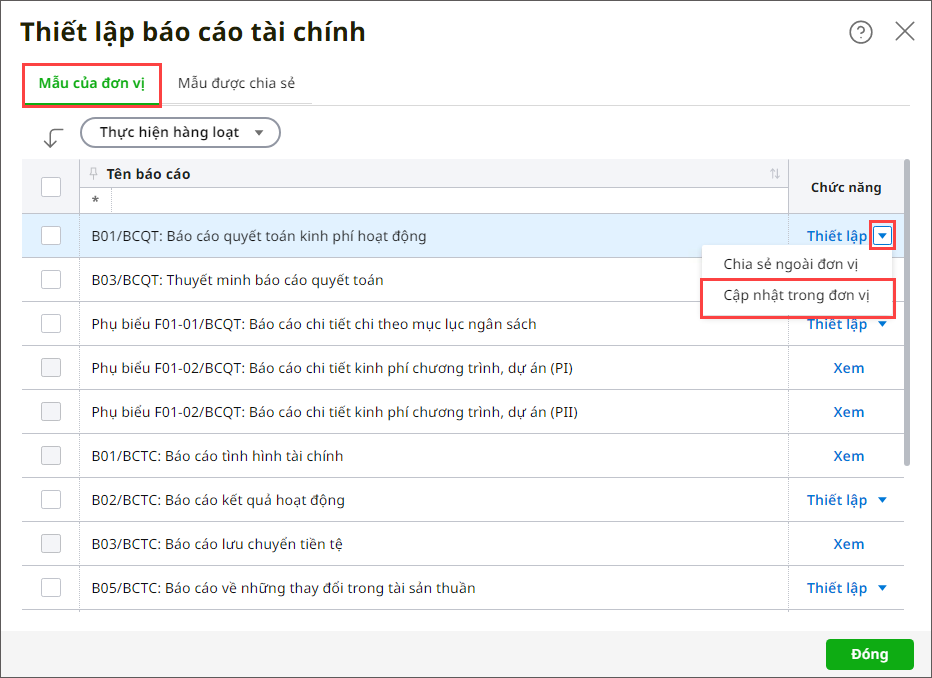 Bước 2: Vào tab Mẫu của đơn vị. Bước 3: Để cập nhật công thức báo cáo cho các dữ liệu trong cùng đơn vị mà người dùng được phân quyền và có cùng chế độ kế toán với dữ liệu đang làm việc, nhấn ⏷Thiết lập, chọn Cập nhật trong đơn vị.