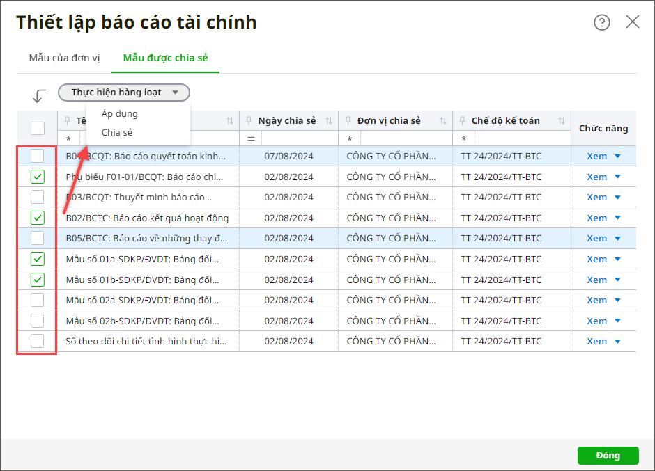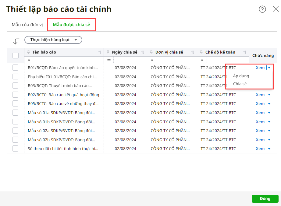 Bước 2: Vào tab Mẫu được chia sẻ. Bước 3: Tại tab Mẫu được chia sẻ: Hiển thị danh sách các mẫu báo cáo được chia sẻ với đơn vị.