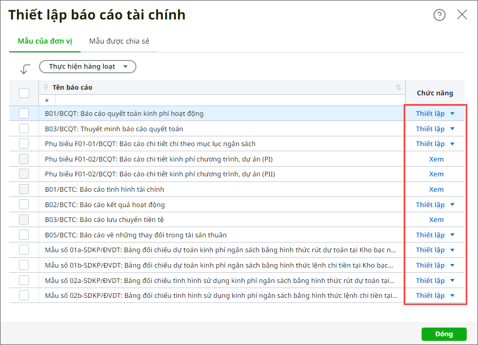 Bước 2: Tại tab Mẫu của đơn vị, các báo cáo cho phép thiết lập công thức sẽ hiển thị nút Thiết lập, anh/chị nhấn Thiết lập tại báo cáo cần chỉnh sửa công thức. Lưu ý: Những báo cáo chỉ hiển thị nút “Xem” thì không thể sửa hoặc thiết lập lại công thức mà chỉ xem được công thức trên phần mềm