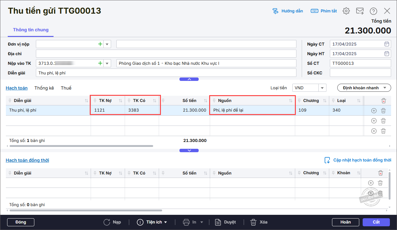 - Nhập thông tin chứng từ chi tiết: Tài khoản Có, Số tiền, Nguồn chọn là Phí, lệ phí để lại.